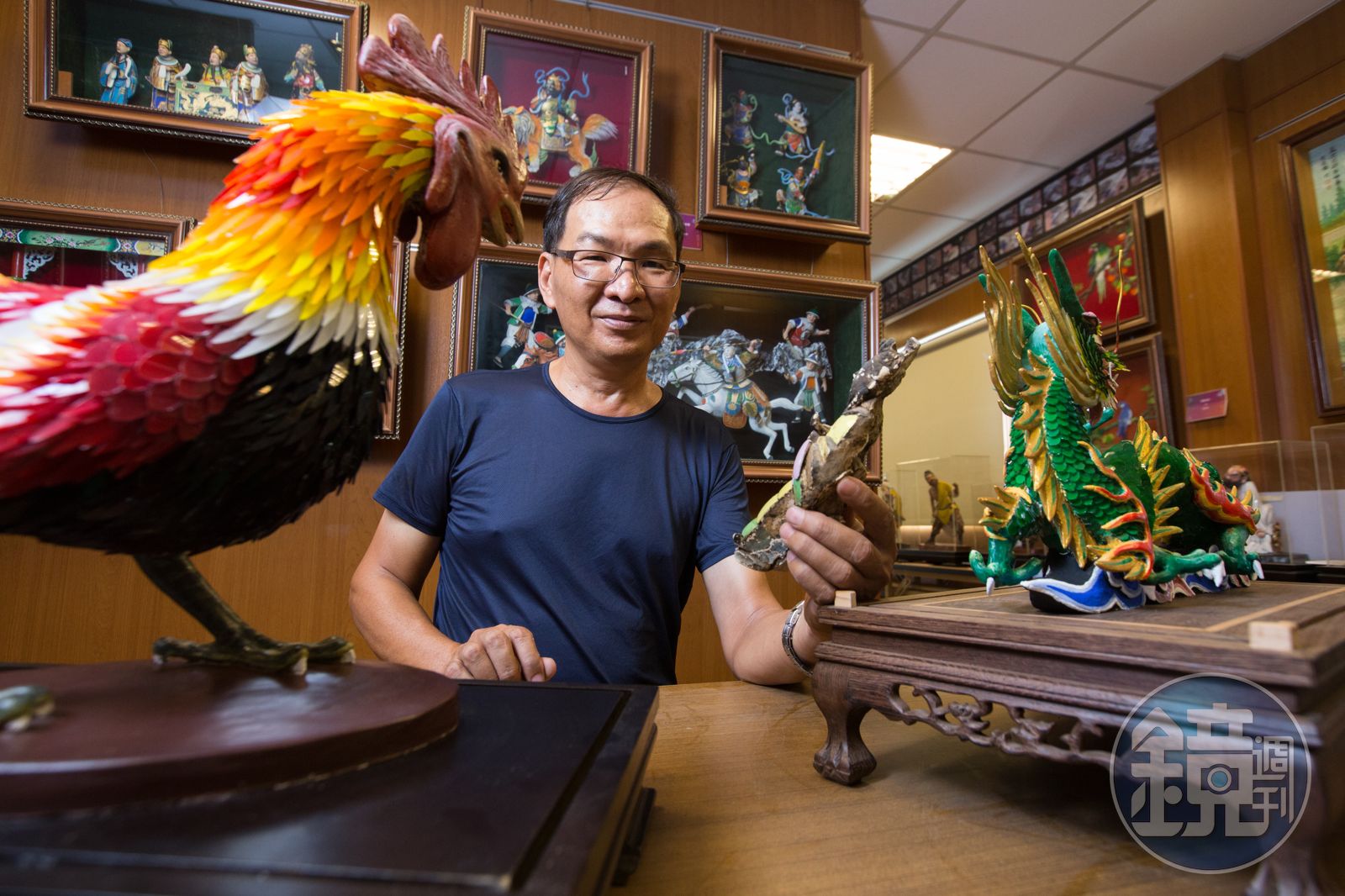 只是收藏數量仍有限,早期剪黏需附著於牆上,皆為半立體,1999年葉明吉嘗試創作全立體作品,還瞞著父親。「他一直澆冷水,說別傻了,那很難。」利用收工時間,他花了半年偷偷創作《朝天龍》,2000年參加藝術家協會聯展,由當時市長許添財點睛,父親才發現。「其實他覺得做得不錯,但罵我『黑白做,沒嘎恁北尊重』,這種用詞,我知道他是稱讚。」