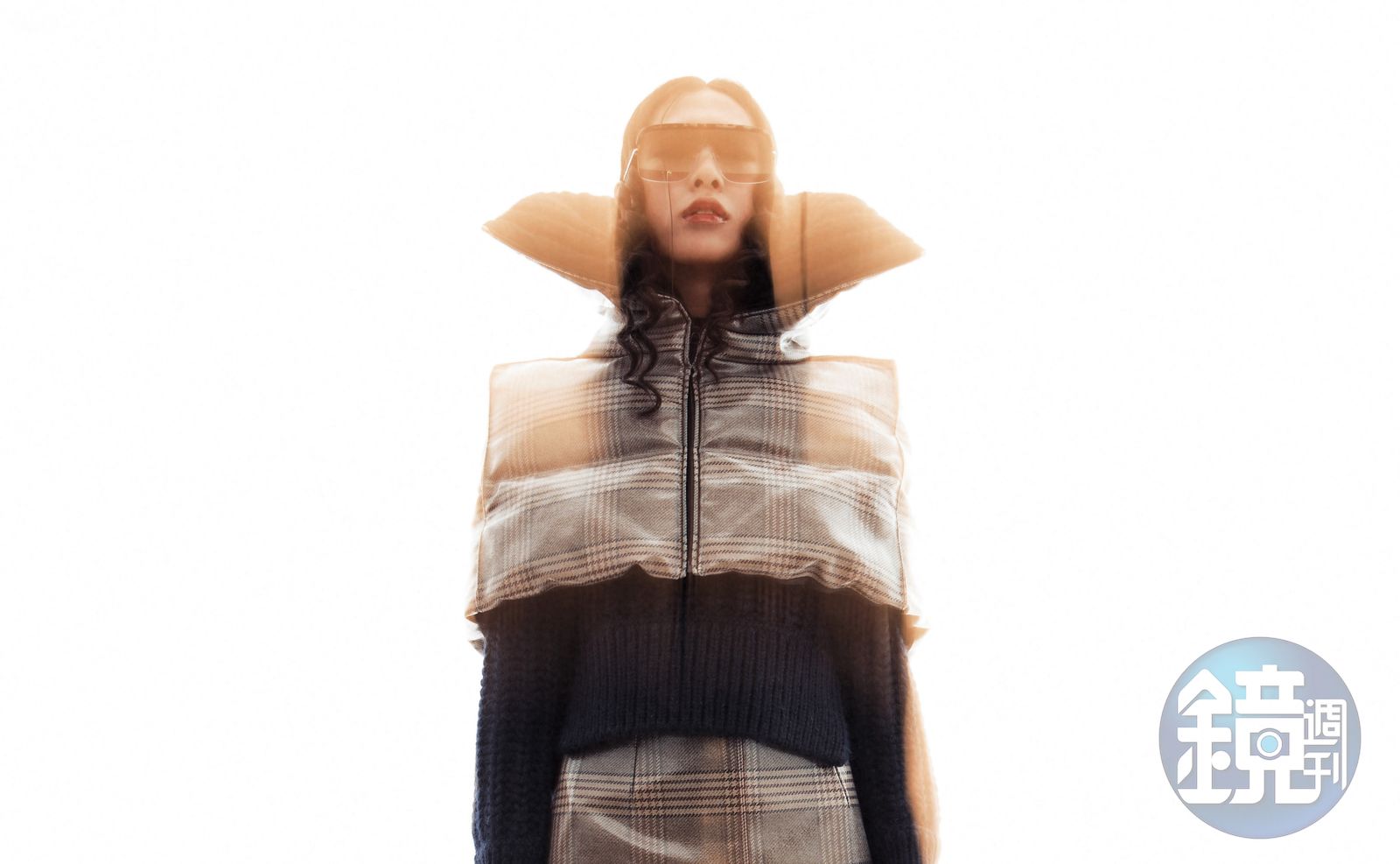 棕色護目鏡。NT$18,000 by CUTLER & GROSS/格紋造型羽絨短外套。NT$54,000 by FENDI/深藍色毛衣。價格店洽 by FENDI / 格紋長裙。NT$68,000 by FENDI / PVC材質短靴。約NT$34,000 by Christian Louboutin