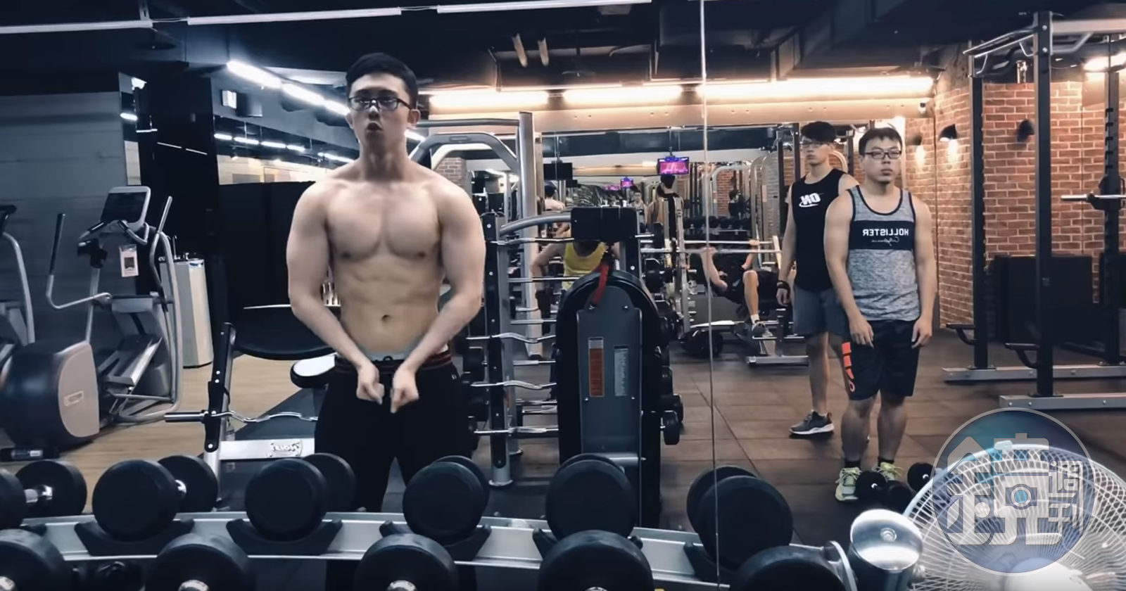 隨後他改舉啞鈴,和80磅啞鈴臥推,一輪訓練過後他在鏡前脫衣驗收健身成果,胸肌和腹肌挺搶眼。他說自己現在70公斤,又表示「很久沒做重量了,姿勢不好請見諒!」