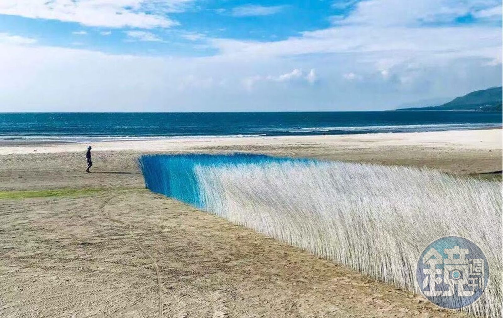 在沙灘上的《迎風逐浪》,是游文富的作品,8萬根竹籤一支支插入沙地內,落山風吹起,竹籤如浪。白色與藍色結合的竹籤,沙灘上浪濤陣陣。李維睦的《走那飛魚》將風、魚,與人結合,在魚身上裝上風車,風起葉片轉動,彷彿魚身也隨之擺動。