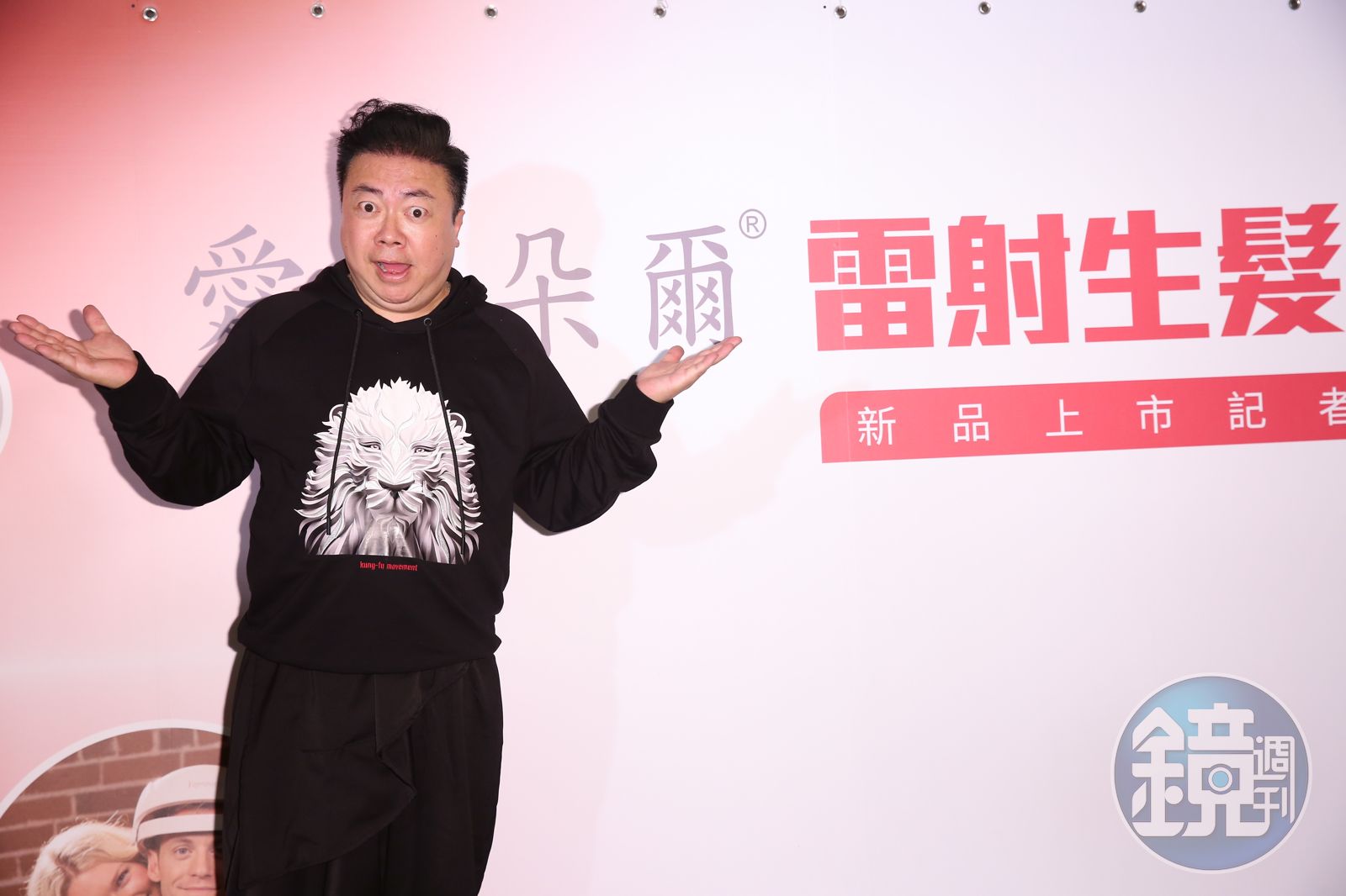 董至成透露自己是產品第一代產用者,多年來依靠它不再怕頭髮掉光光,左為楊名權醫師。過去他很害怕走到人多地方,因為很自卑,怕別人都在看他的頭頂。他表示,在演藝圈工作,圈中帥哥美女很多,有人去整型來變美,而他自己很在乎頭髮,如今不怕被比下去。