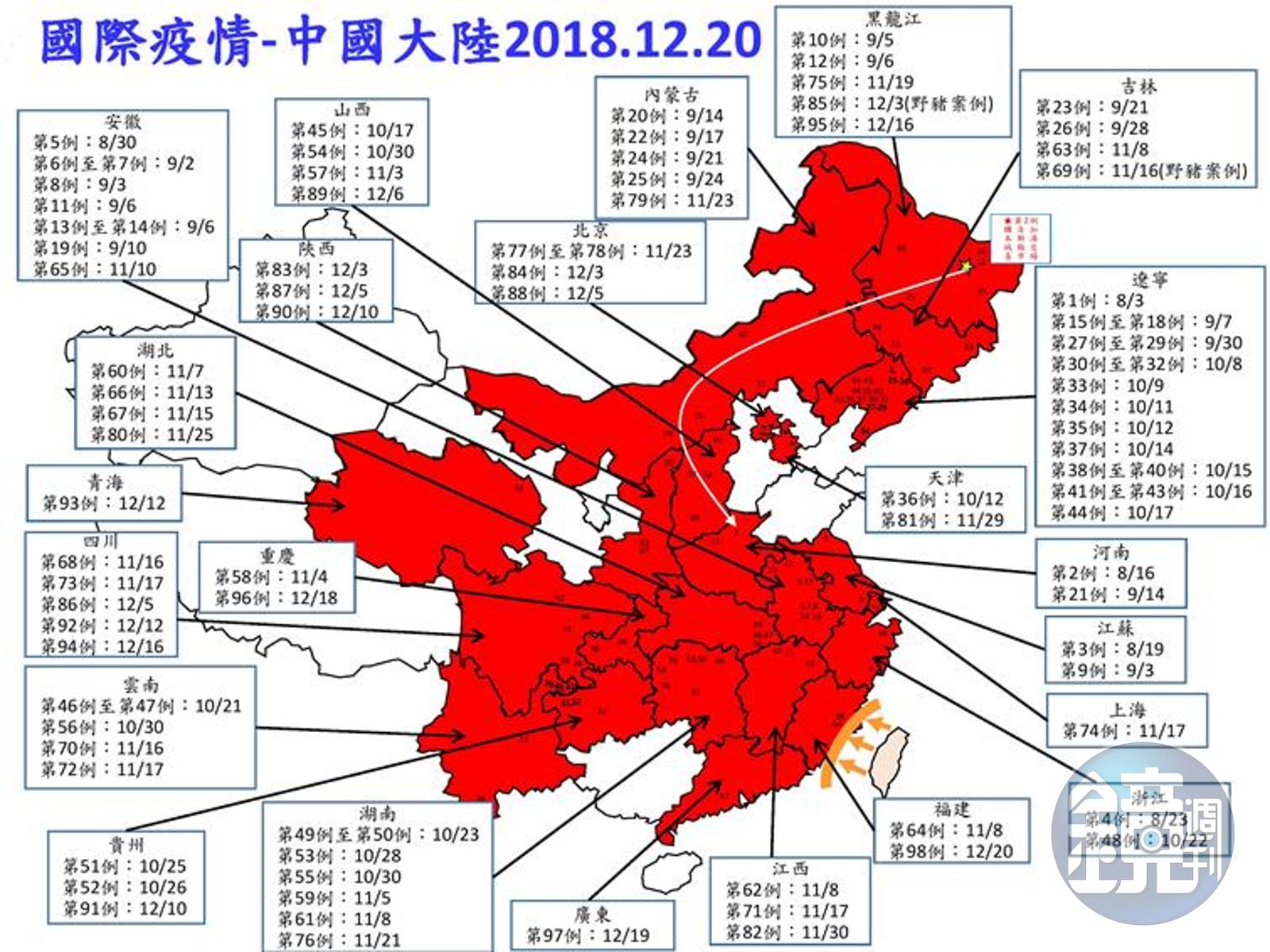 中國大陸農業農村部在官網公布,昨上午8時收到動物疫病預防控制中心報告,經福建省動物疫病預防控制中心確診,尤溪縣一處養豬場發生非洲豬瘟疫情,而這家養豬場養了生豬1萬1,950頭、發病27隻、死亡27隻。