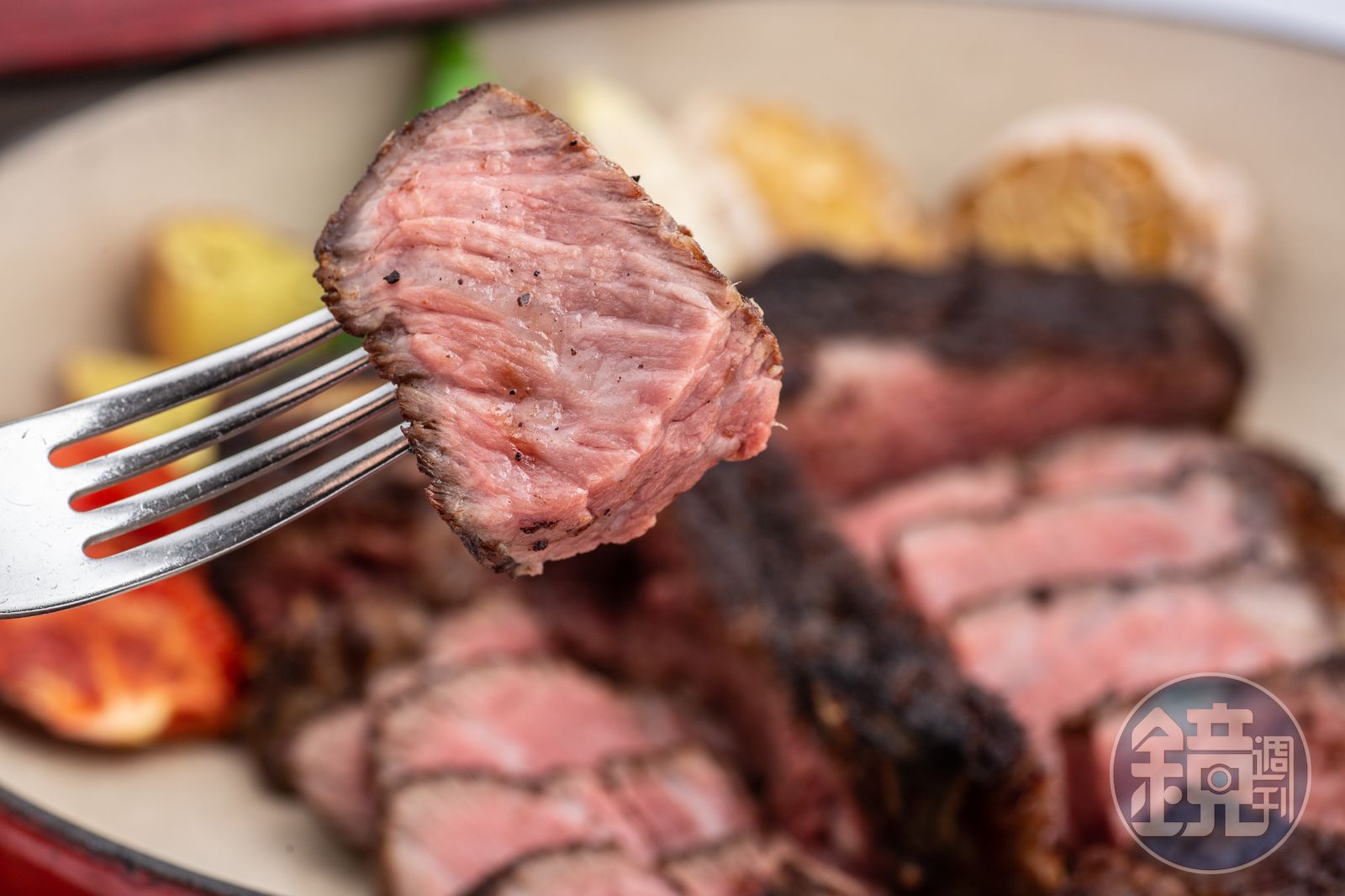 張守義選了重達13公斤的澳洲和牛丁骨牛排,經一個月熟成,煎烤前修肉不會把牛脂肪修得太乾淨,至少會保留0.5公分厚度,放上煎板時遇熱就融為牛油,用來把牛排較窄的三邊封烤保留肉汁,接著再把牛排放入360度輻射熱源的烤箱。