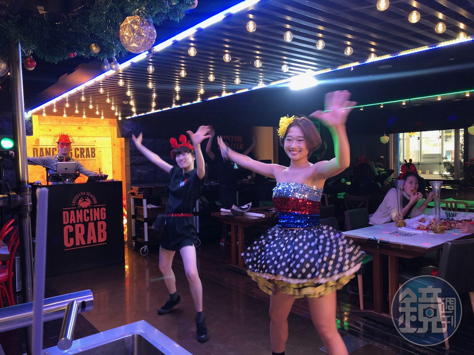 出發前,已被多次提醒,這間店不好拍,因為從頭到尾都像夜店一樣High。那時腦海浮現的是過去有辣妹跳舞或搖呼啦圈的酒吧,不禁想冷淡如我輩,真的打從心底嗨得起來嗎?不過一靠近門口,「Joy to the world」的聖誕音樂震耳欲聾,門口的帶位人員笑臉吟吟的遞了一頂紅色蟹螯髮圈給我,笑容有魔力,我就像被制約般毫無抵抗地戴上,一路被引導穿越全體人員夾道熱舞的Hi Five隧道,無論男女老少、外場內場,全都跟著節奏擺動,霓虹閃爍,開心的氣氛已經在入門的那一刻點燃。
