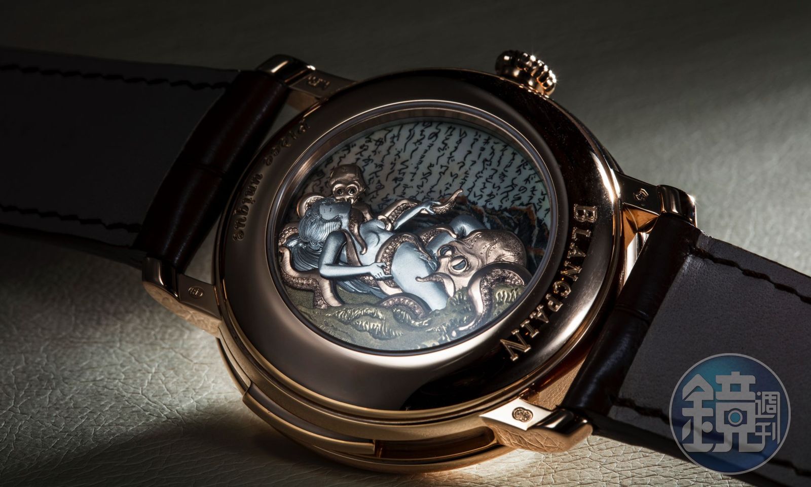 很難形容,初次看到畫面中這款手錶時的感受。瑞士錶壇所製作的「春宮錶」固然特別,然而看多了西方製錶師所雕繪的春宮畫,總覺大同小異,已很難有驚豔之感。這一次,寶珀推出的最新春宮三問錶,竟然取材日本浮世繪大師葛飾北齋的春宮畫《章魚與海女》圖。對我來說,這已不僅是驚豔而已,簡直是五雷轟頂那般的震撼。太經典,也太大膽,完全超越春宮圖的層次,也讓瑞士製錶工藝達到藝術的另一層境界。