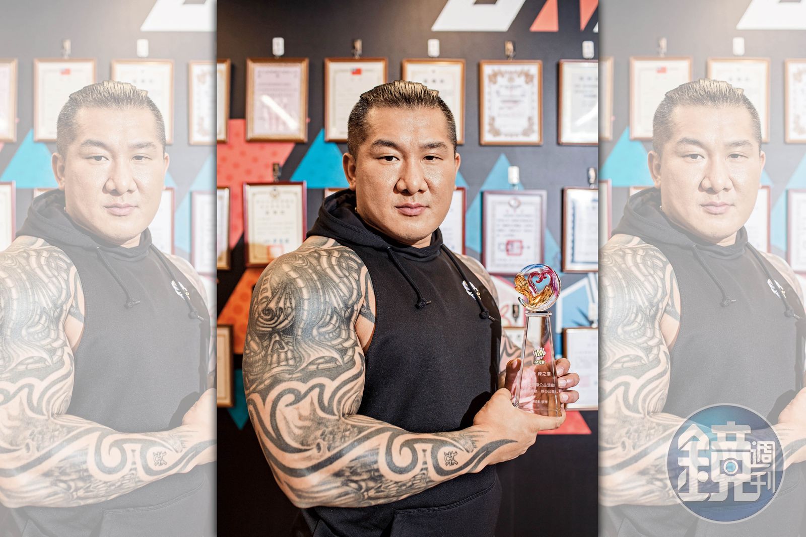 走進館長的健身房,一進門兩面牆上滿滿都是做公益所獲得的感謝狀,可見館長對於公益的熱切之心。館長坦言平時就收到非常多公益邀約,但他的原則是不為個人,只為團體,「我最關注兒童議題。」因此「為愛深蹲」活動結合運動和兒福聯盟的公益活動,讓他決定參加。