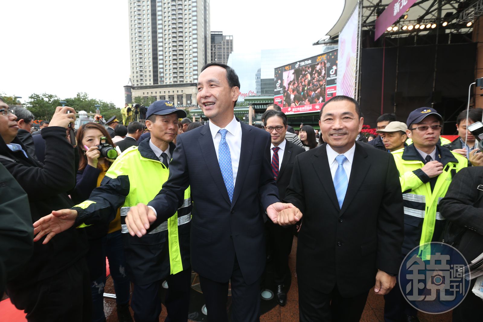 朱立倫講完隨即要離開新北市政府,市府員工排成兩排歡送,因人數眾多且十分熱情,不斷有人喊「選總統」,場面一度混亂,1分鐘路程走了近15分鐘才搭上車,夫人高婉倩與兒子也在車上等候。
