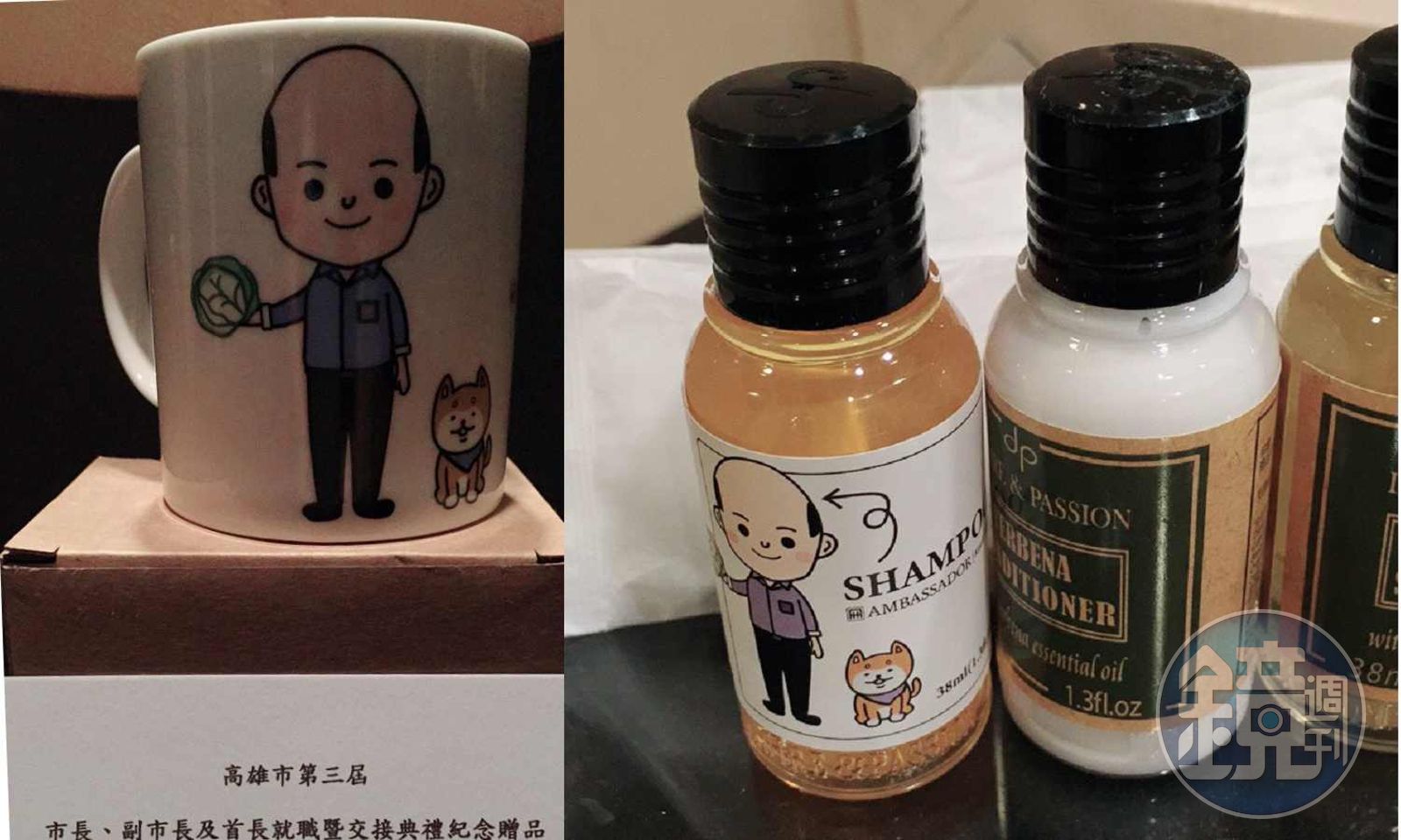 韓國瑜就職,高雄飯店贈送住宿紀念品,禿子洗髮精讓房客傻眼 (網友提供)當他轉身進入浴室時, 洗手台上的紀念品真的看傻眼,韓市長Q版畫的洗髮精,還拉箭頭特別標註禿頭,房客當場傻眼,這禿子洗髮精到底洗還是不洗,那個特別拉出來的箭頭實在太幽默,好像預告洗了就會跟韓總一樣,讓人心裡超糾結。