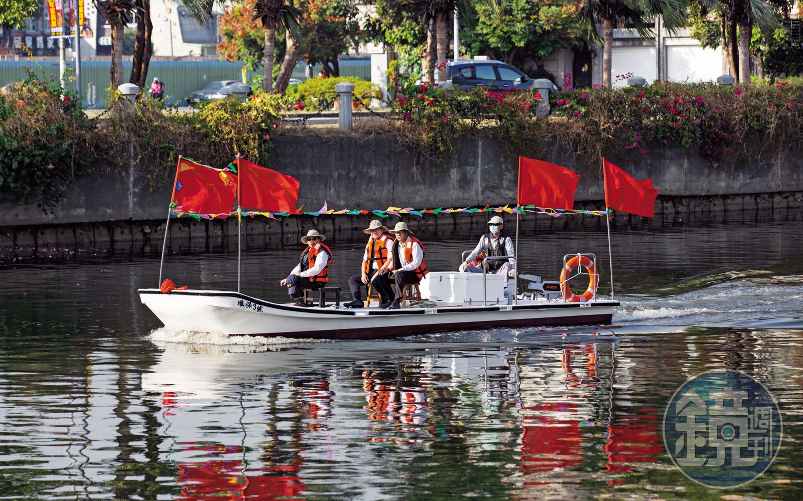 21日下午2點,高雄九如路與同盟路旁掛起一塊紅布,上頭寫著「環保局愛河環保竹筏啟航典禮」。本刊觀察,參與典禮的幾乎都是環保局內部員工,大夥等了半小時,環保局長蔡孟裕才好不容易來到現場,他帶頭上香祈福,隨後穿著救生衣在浮動碼頭上,仿效漁船啟航儀式開香檳、放鞭炮,再登上其中1艘清潔船,向岸邊撒糖果,環保局員工搶接局長丟下的喜糖,掀起啟航典禮的最高潮,隨後2艘環保清潔船即載著局長及官員簡易試航。