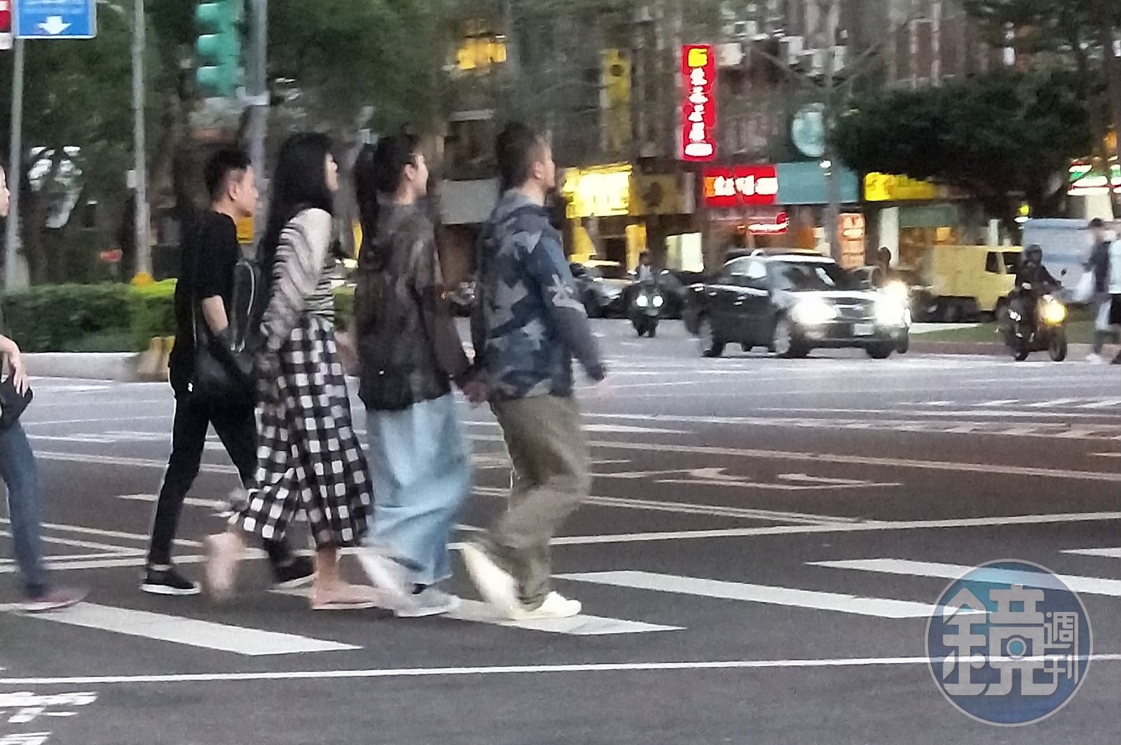 九把刀和周亭羽出現在建國花市附近,兩人手牽手過馬路,一路上有說有笑,還同樣穿著迷彩情侶外套,過馬路時周亭羽腳步相當輕快,身型看起來也頗纖細,不像是懷有身孕的感覺。