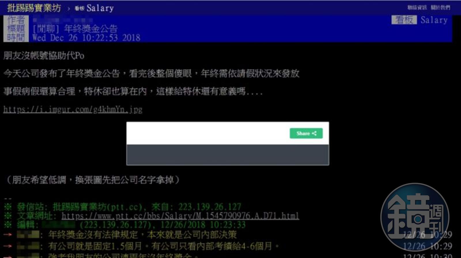 網友PO文指出,朋友的公司宣布12/28發放底薪一個月的年終獎金,但是會針對當年度的出勤狀況進行調整,讓原PO的朋友相當傻眼。