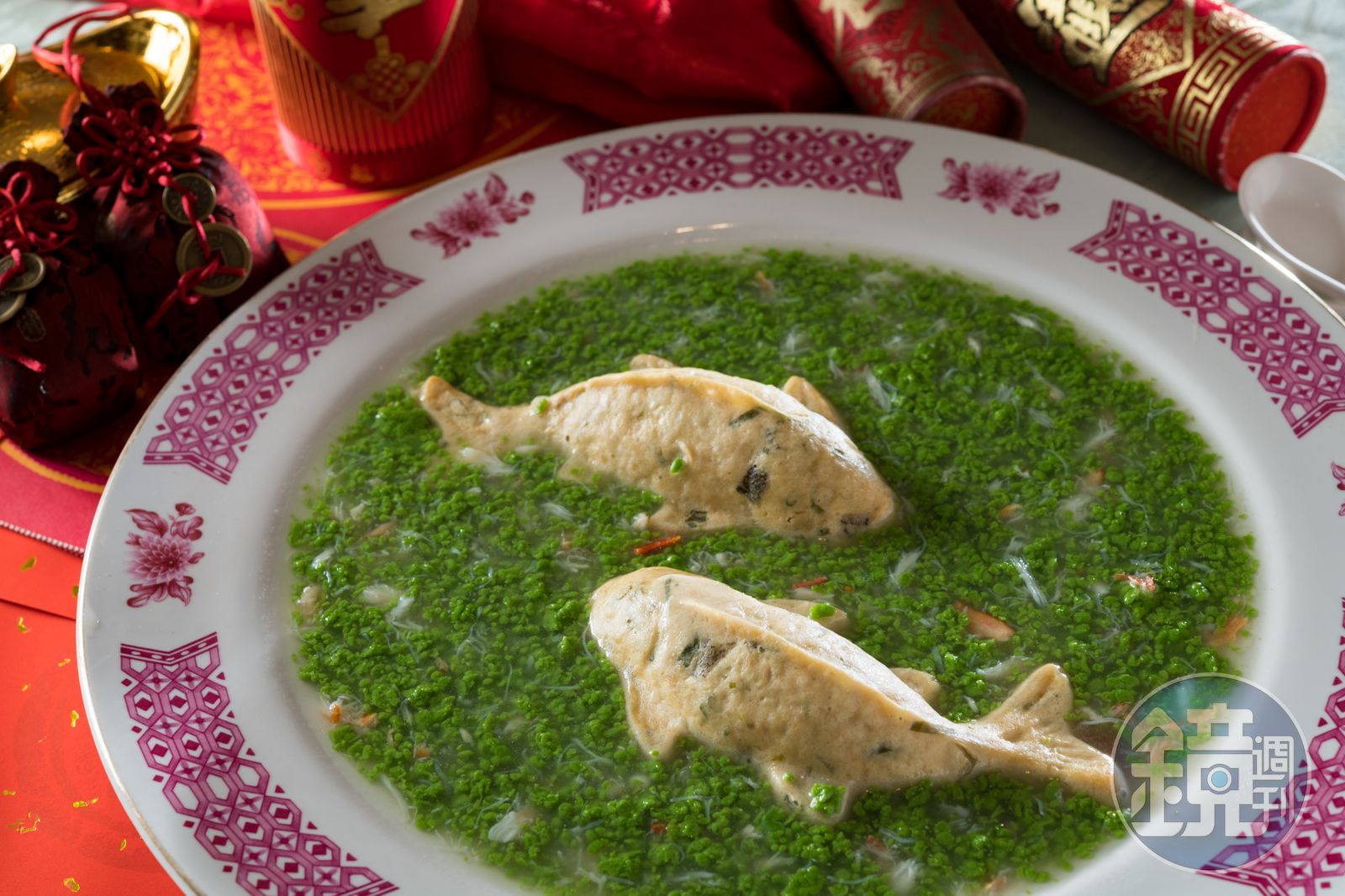 「蓬萊邨」主廚王永宗,用新鮮的魚肉魚漿做成的二尾「魚肫」,倒扣在羹湯盤,淋上菠菜翡翠羹,那魚就好似在浮萍水池裡擺尾游了起來,這道快要消失的老菜「翡翠魚肫」,用石斑魚、豆腐等食材復刻台菜風華,在年節上菜還有「年年有餘」的吉祥意思。