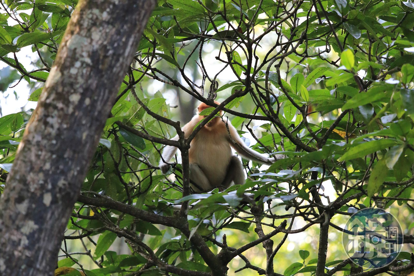 公長鼻猴的鼻子大而下垂,母長鼻猴鼻子較尖且上翹,兩者外型特徵很容易辨識。雖然在船長的帶路下,我們很快就找到長鼻猴,但想清楚捕捉牠的身影,卻得靠運氣。長鼻猴似乎很懂利用樹叢躲鏡頭,就算看得到牠們,也很難看清全貌,於是一群專業攝影師們,也只能喃喃自語央求長鼻猴賞臉,讓我們能拍到一張沒有被樹葉遮住的正臉。