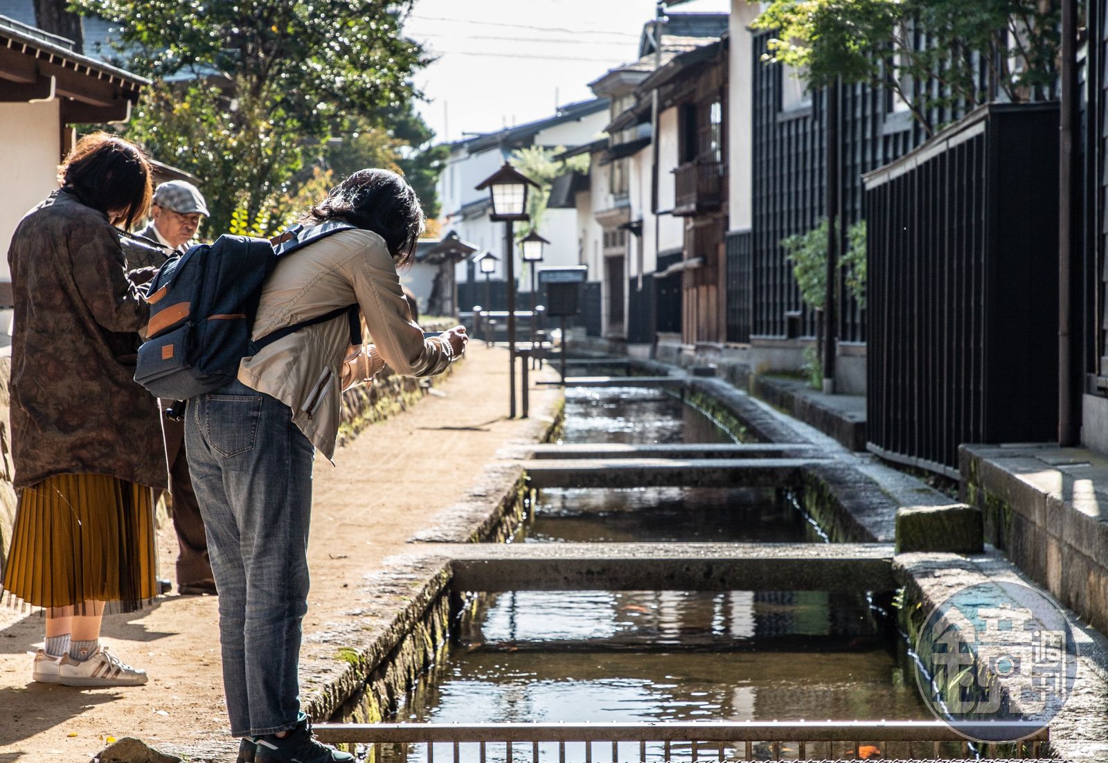 散步於古川老街,除了抬頭找各式各樣「雲」的圖案,也別忘低頭找找在清澈溝渠裡的驚喜,早期用來灌溉農田的小水渠「瀨戶川」,現在水裡有千條鯉魚悠游其間,成為古川一大特色,一旁還設了一個魚飼料的誠實小舖,讓遊客可以隨時停下腳步,享受餵魚的樂趣。
