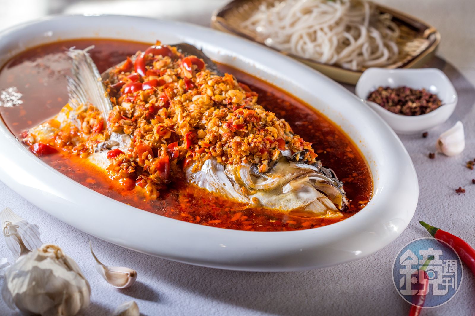 好比讓客人一吃難忘的「湘味剁椒鰱魚頭」,除了嚴選來自曾文水庫,新鮮無土味的鰱魚,還特製剁椒醬為菜色注入靈魂,裡頭包含醃漬過的燈籠椒、5種辣椒煉成的辣油。一上桌氣勢懾人,但魚肉嘗來辣氣溫和,麻味徐徐蔓延,自然發酵的酸香味,增添味覺層次。