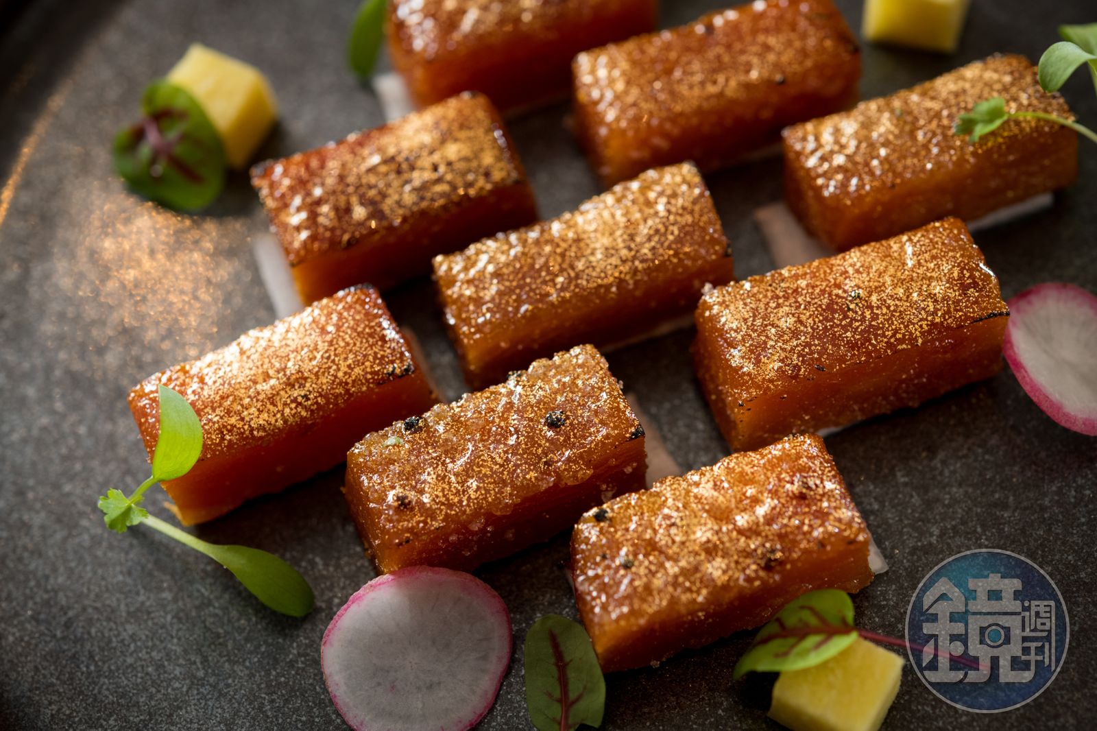 為餐廳射下二星的主廚林菊偉是台灣囝仔,端出來的菜色細緻優雅,從「小菜」即見真章,淘洗、調味過的新鮮屏東雨來菇填入中卷的「雨來菇中卷」,清爽彈牙;切成細段、堆疊整齊的「油醋珠蔥」,頂端點綴上晶瑩剔透的油醋凍,酸香開胃;過年必吃的烏魚子撒上金粉與砂糖,炙燒出脆皮糖衣,以為在吃焦糖糖果,這幾道還只是小菜,精細程度不輸日式料理,選在請客樓請客的確臉上有光。