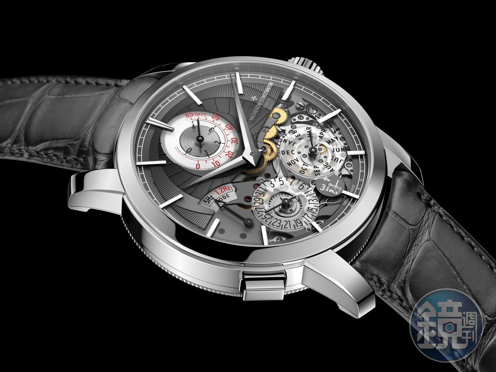 另外一個重點,為了讓指針式萬年曆的行走更加精確,江詩丹頓開發了日期、月份和閏年的瞬跳顯示功能。並為此重新設計了跳轉機構,採用懸掛式雙齒輪複合系統,讓瞬跳機制所需扭力只有傳統跳轉顯示的四分之一,不僅節省大量動能,也完全不會影響走時機制。在跨年倒數時,三個地方同時瞬間跳轉,其景象比起跨年煙火還要更吸引人。