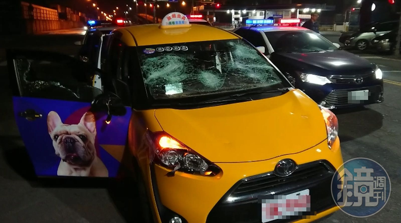 無辜計程車要載3名酒客離開遭波及,整輛車被砸爛。(警方提供)發布時間:2019.01.15 11:10 臺北時間