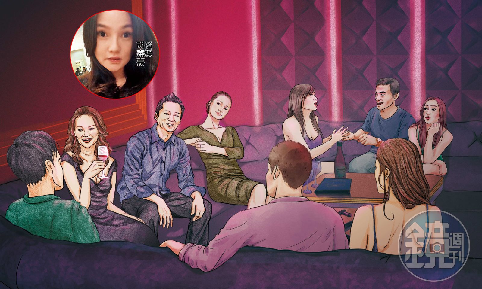 本刊檢視胡嘉嘉的消費明細,她在該家酒店幾乎都會點紅牌小姐「陳琳」的檯。陳琳告訴本刊,第一次胡嘉嘉來店內時說「很會喊數字拳」的留下,她就留下來陪酒,當天的檯費19,000元,後來第二次胡嘉嘉直接點她的檯,坐檯費加點檯費13,000元。陳琳說:「我印象很深,她來二次都是簽帳,也聽幹部說還沒回單。」