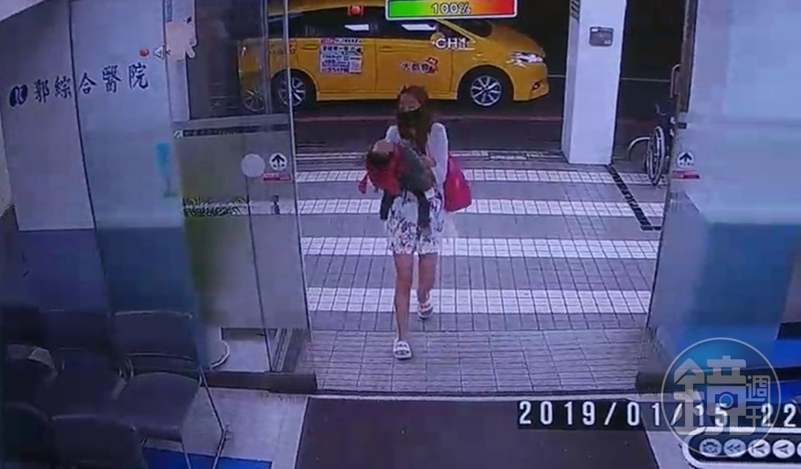 醫院監視器曝光,女童生母坐男友計程車到醫院,當時女童頭往後仰顯示已經沒有意識。(警方提供)發布時間:2019.01.16 10:46 臺北時間