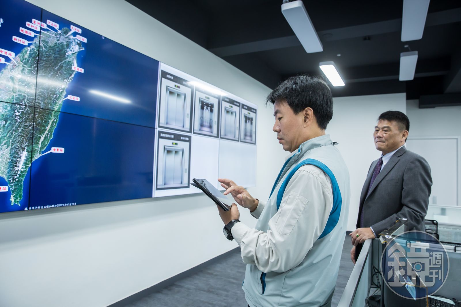 「這是我們全台灣的維修保護與電梯監控中心。」採訪這天,崇友實業總經理游本立帶著我們,進入鮮少對外公開的崇友中控室。「現在螢幕上在跑的就是台北的台肥大樓,電梯現在是往上還是往下我們一目了然,只要電梯發生故障,這裡馬上會收到警示聲音,燈號也會從正常的綠色變紅色,通知我們的維修人員,第一時間前往維修。」