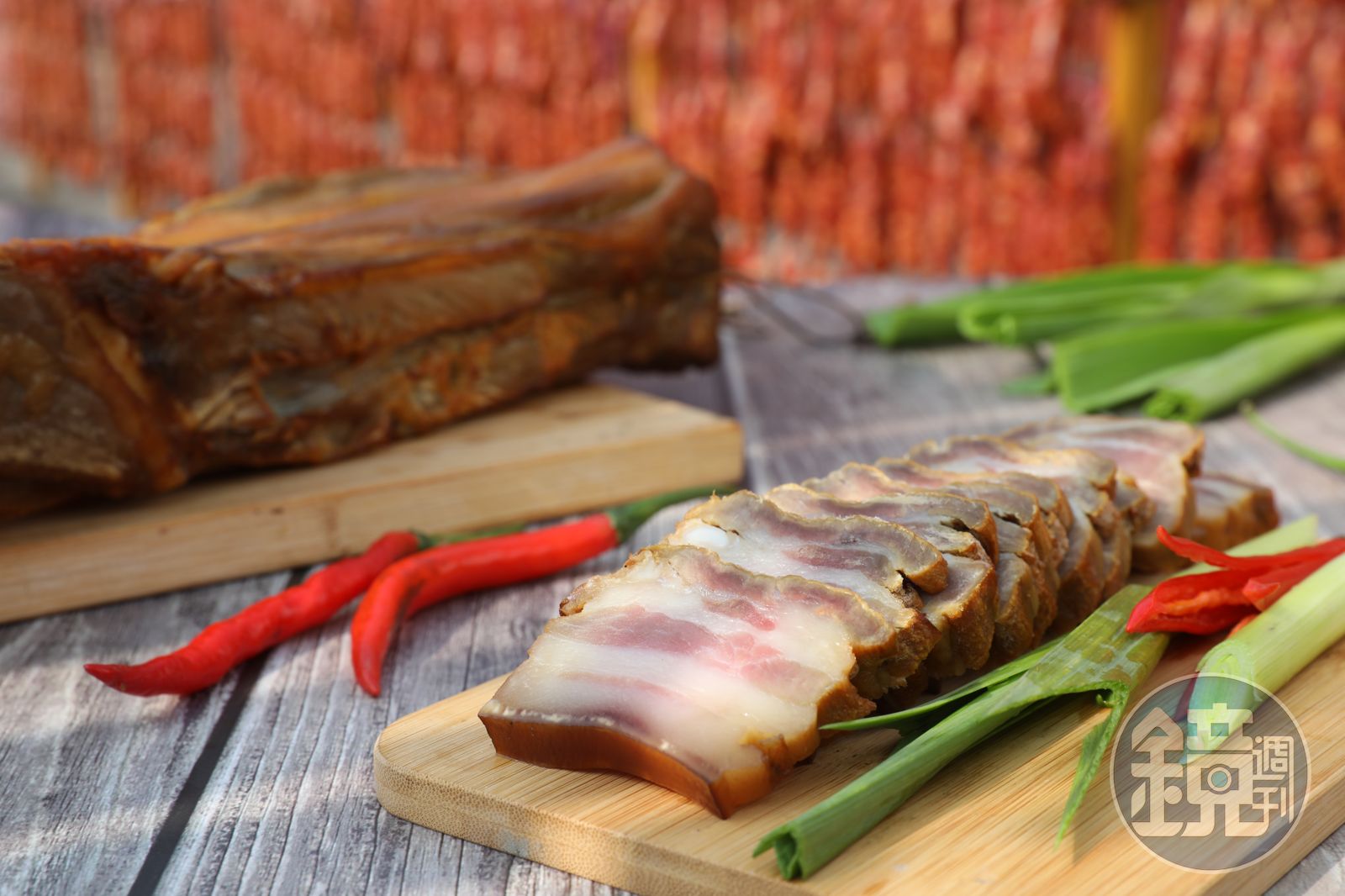 曾在文化圈工作的李嘉陵,中年回家接棒,也簡直潔癖式地恪守老爸留下的臘肉信條,不加硝、防腐劑、香料,醃料甚至連醬油都不用,只以鹽冷藏醃漬6天,滌淨血水後日曬風乾,再用粗糠和碎米燻上5至7天。臘腸的腸衣也要仔細洗淨,而且只用指定養豬場來的溫體豬,沒有豬羶味,等於阻絕一切蒼蠅喜歡的要素。