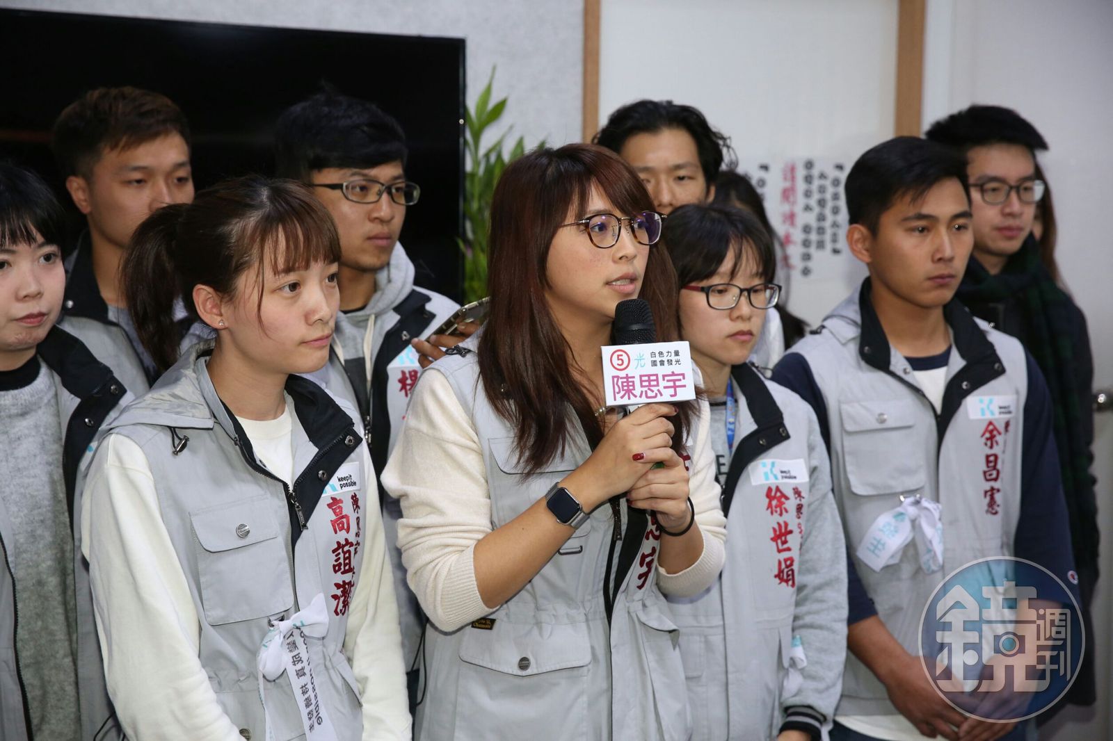 昨(27日)陳思宇發表敗選感言,她表示未來還是會繼續追隨阿北(柯文哲),讓白色力量可以繼續前進;她也在臉書也說,「思宇的努力不夠,思宇會檢討,時間緊迫、組織相關等,投票率也沒有預期這麼高,思宇會深深檢討。」