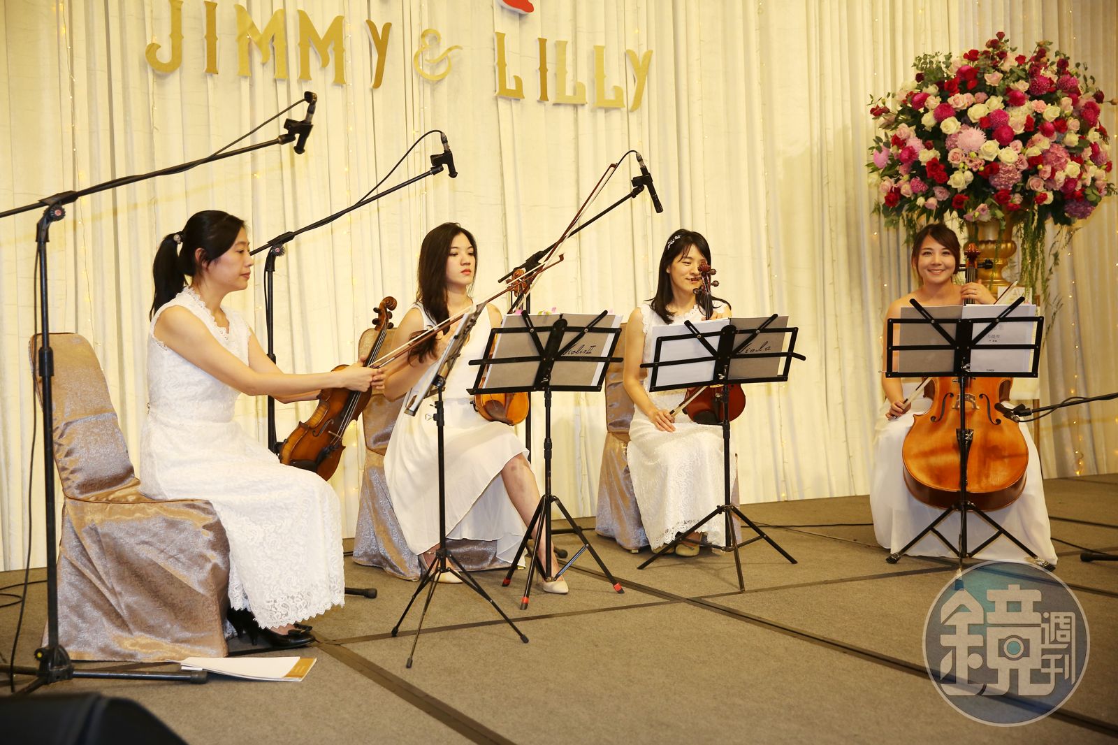 尤其婚禮上的音樂表演節目,可以看到台上有4位優雅的提琴手,身穿白色禮服,為賓客演奏美妙的旋律,這不是特別請來的表演嘉賓,而是陳冠翰的表妹,她們有的是藝享愛樂團成員,有的曾在金曲、金馬獎上獻藝,讓賓客忍不住讚嘆:「這場演奏已經是音樂會等級了!」