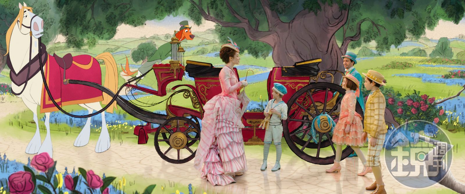 但《歡樂滿人間》當年在奧斯卡拿下5項大獎,包括最佳女主角、電影歌曲、視覺特效等。這也是影史第一部把動畫與真人透過特效,合成在同一個畫面,還讓動畫人物與真人演員互動的過程,栩栩如生,推出後造成轟動。因此到了《愛.滿人間》,還特別找來皮克斯與迪士尼的動畫師,設計出一系列的手繪動畫結合演出的場景,讓企鵝、大象、小狗穿上套裝與主角一同共舞,更讓孩子爬進浴缸跳進海洋仙境,創造出歡愉奇幻的想像世界,除了向前作致敬,更為電影帶來一股清新且令人著迷的氛圍。導演勞勃馬歇爾感動地表示:「我們都非常高興能將這種獨特的藝術形式重現大銀幕,能夠有機會與這些迪士尼、皮克斯動畫師合作,將親手繪製的每一幀畫面放進作品中,對所有人來說都是一生難有的激動。」