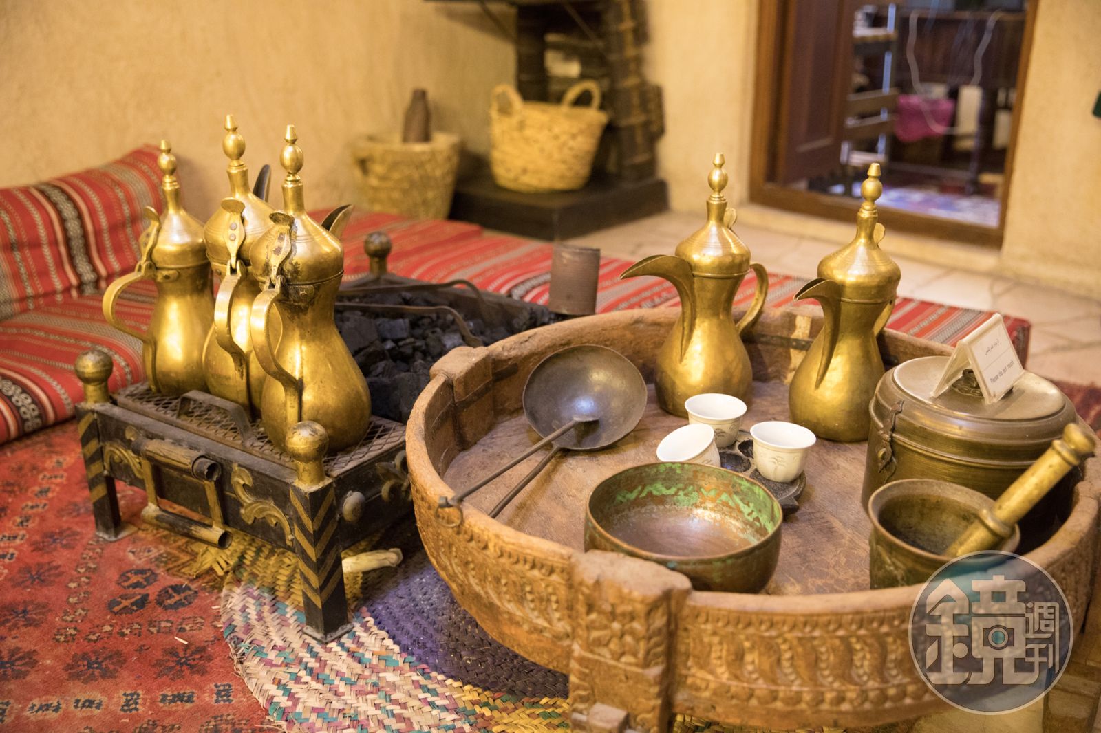 走上二樓,天井的另一頭有一個咖啡吧,賣著各種現代咖啡,當然也供應帶著強烈荳蔻香氣的阿拉伯咖啡(Gahwa),Gahwa通常會裝在經典的阿拉伯咖啡壺(Dallah)中,斟在無把手的小杯子裡,再呈給客人,這裡雖然只給一杯,但也依傳統方式,送上一盒椰棗,在吧台邊啜飲藥草香氣濃郁的Gahwa,邊欣賞老屋風光,倒也是不錯享受。