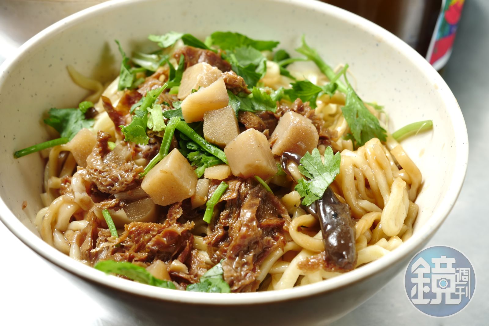 招牌「乾麵」賣相簡樸,麵條上澆著用豆輪炒成的素肉燥和筍丁,外加幾根豆芽菜陪襯,拌著吃相當爽口,卻不會覺得清淡無味,淋些玻璃瓶裝的蕃姜醬,甜甜辣辣、氣味更豐富。