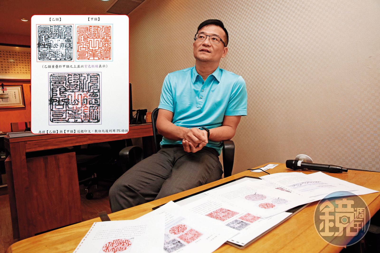 總經理沈維忠針對申請書上共有二個手刻的方章圓章,以及長方型的橡皮章進行鑑定,將印章交疊比對,確認筆畫、角度和外圍形狀皆與莊明湖提供的樣本有所出入,但沈維忠語帶保留。