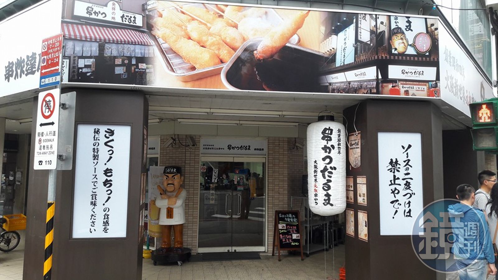 創立於昭和4年,來自日本大阪新世界元祖串炸「大阪新世界串炸達摩」有近百年的歷史,是遊客到大阪必訪的美味名店。招牌Logo「惡叔叔」強調串炸的醬汁禁止「二次沾醬」,因為醬汁共用考量衛生問題。
