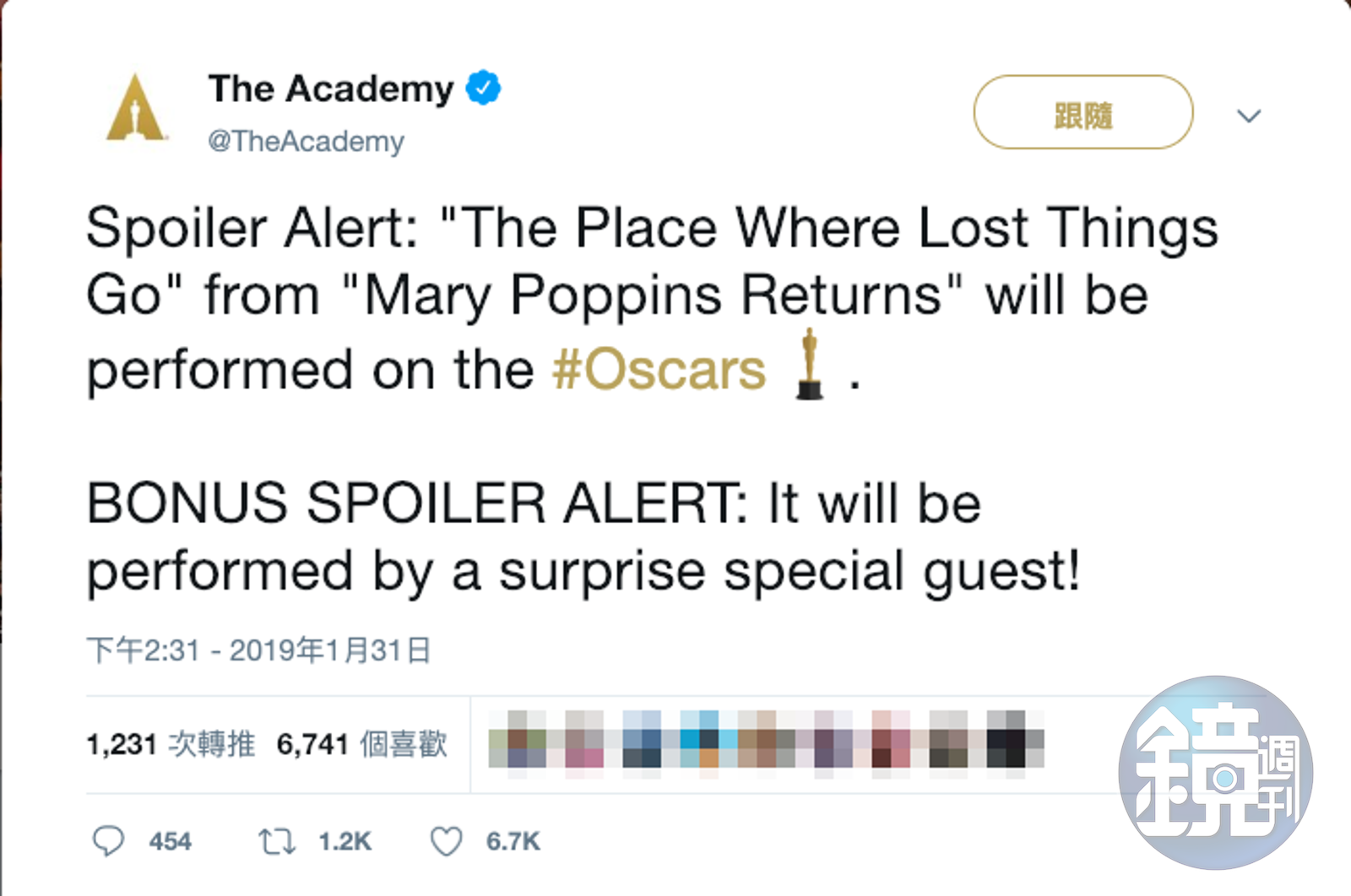 除了《黑豹》的電影歌曲〈All The Star〉,《一個巨星的誕生》的〈Shallow〉之外,奧斯卡主辦單位美國演藝學院(The Motion Picture Academy)正式宣布,其餘入圍最佳電影歌曲的3首歌,也能在頒獎典禮上表演。包括《RGB:不恐龍大法官》的歌曲〈I'll Fight〉,《西部老巴的故事》的〈When a Cowboy Trades His Spurs for Wings〉,以及《愛‧滿人間》的〈The Place Where Lost Things Go〉。