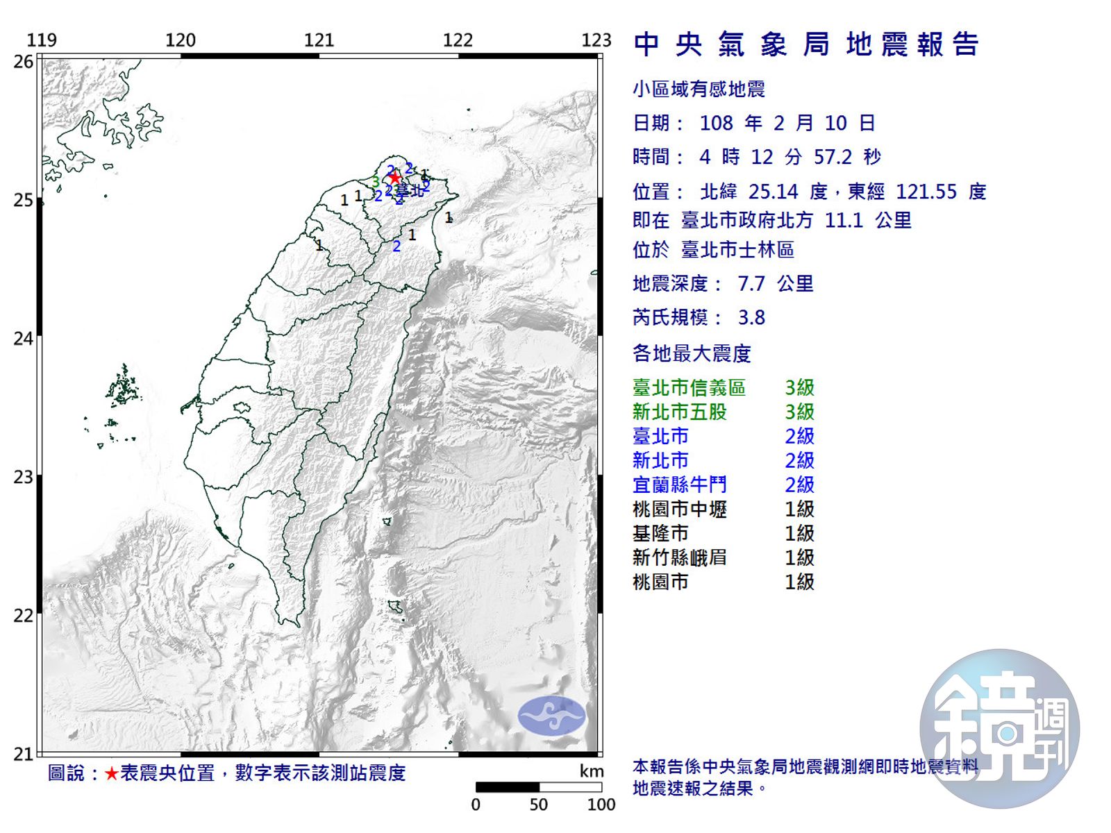 今(10日)清晨4點12分,台北市士林區發生芮氏規模3.8的有感地震,震央在台北市政府北方11.1公里處,約在士林區,深度7.7公里,搖晃時間約5秒;台北市信義區跟新北五股區的最大震度3級,宜蘭縣牛鬥也有2級,所幸各地均未傳出災情。