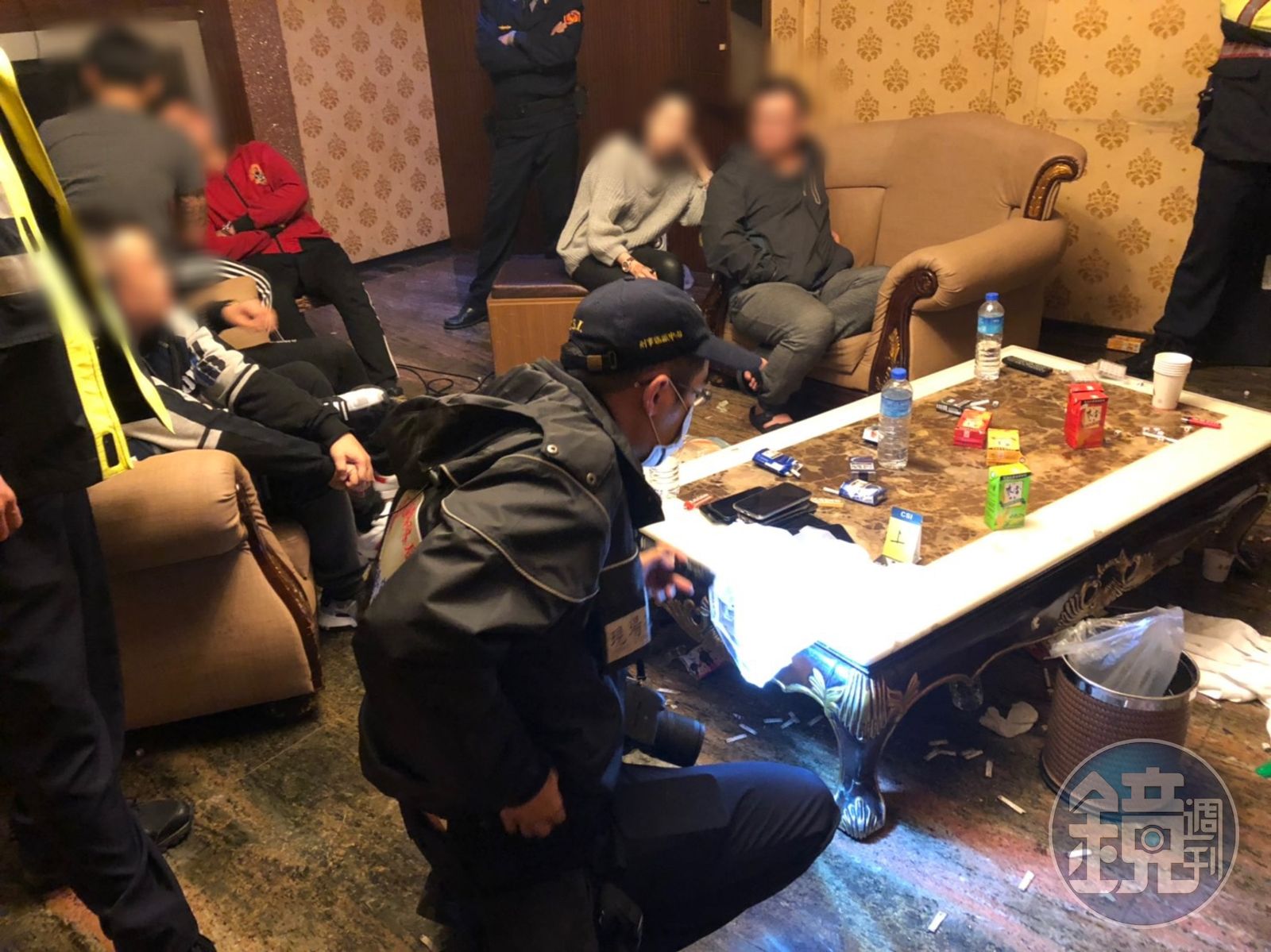 警方一進門就聞到房間內濃濃K味,桌上還有3包重達33.93公克的毒品咖啡包,以及4.37公克的K他命,包廂內的男女東倒西歪,屋內地板凌亂不堪,還有妙齡女子神色恍惚微露香肩,現場一片狼藉。