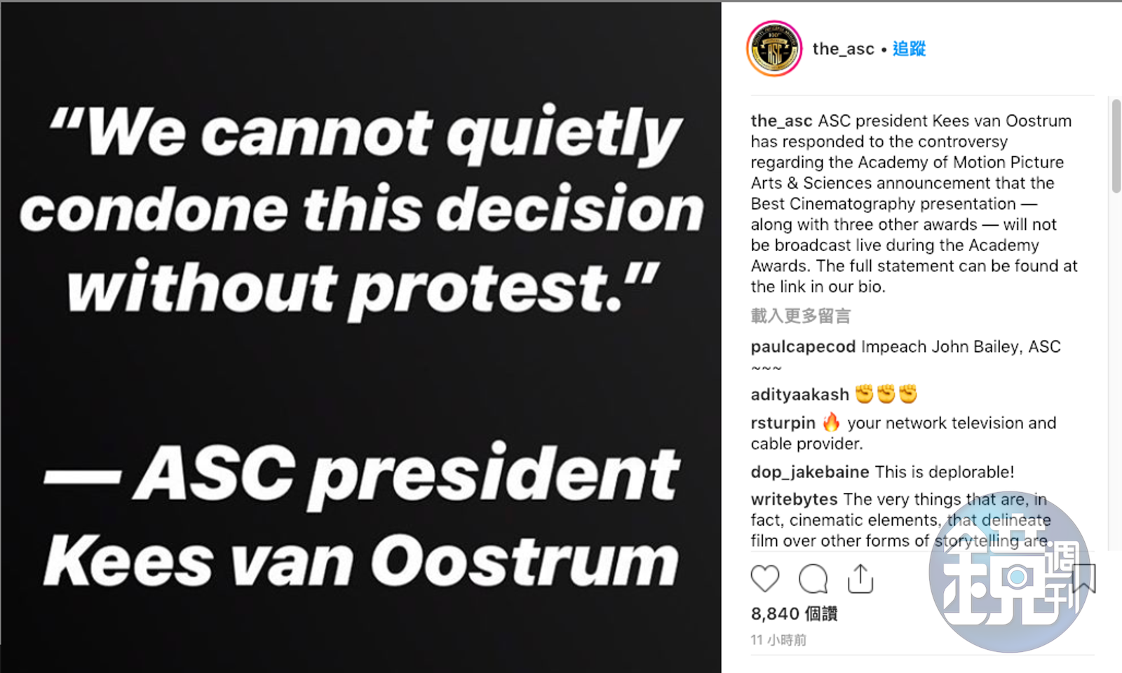 而美國攝影學會(American Society of Cinematographers),也針對奧斯卡的政策發表聲明回應。指出奧斯卡獎已經有91年的歷史,從第1屆開始就有攝影獎,而美國攝影學會則有100年的歷史,比奧斯卡還悠久,可見得攝影對於電影的重要性。所以對於這種在頒獎典禮上「被消失」的安排無法接受,一定要抗議。