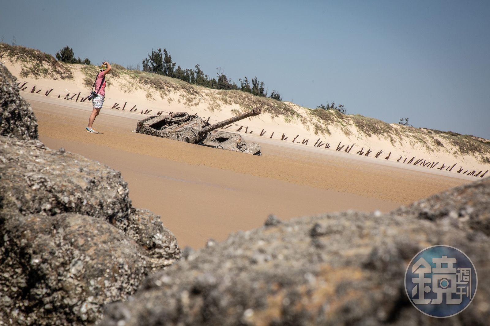 眼前這片參雜著殘敗、冷僻卻奇幻而迷離的場景,加上一望無際的金黃色沙灘與充滿暗礁、深淺不一樣的海岸線,遠方灘頭還插著一支支削尖腐蝕的拒馬,蕭瑟淒冷的氣息,即便在豔陽高照的日子,也揮之不去。