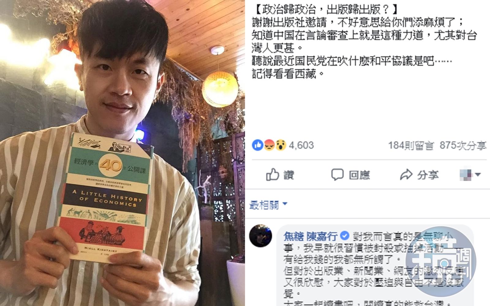 陳嘉行近年在臉書上經常發表政治言論,也常推薦自己的書單,讓他被出版社找上,為書當推薦人,但當他推薦的書籍要進入大陸時,就出現了問題,陳嘉行今發文透露,收到台灣出版社主編的道歉信,內容寫道:「按出版規定,書封必須經中國的中信出版社審查,然上週中信出版社回信,告知作者將推薦人刪除,否則不能出版。」該名台灣主編除了表示歉意外,也透露「這是我從業十多年第一次遇到這種狀況。」