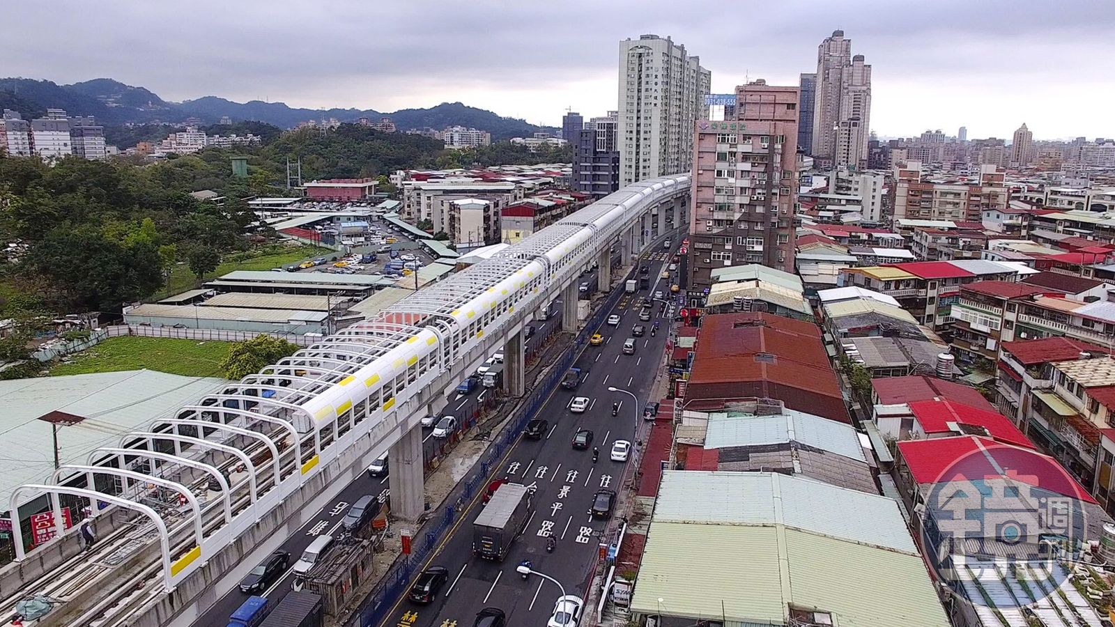 北捷環狀線第一期共有14座車站,連接新店、中和、板橋、新莊區。中和地區因道路較為狹窄,因此採用「疊式高架」設計,有些路段甚至還與快速道路共線。造成高架軌道距離兩側民宅較接近,去年底開始測試列車時,不少沿線居民就抱怨行駛噪音太大。