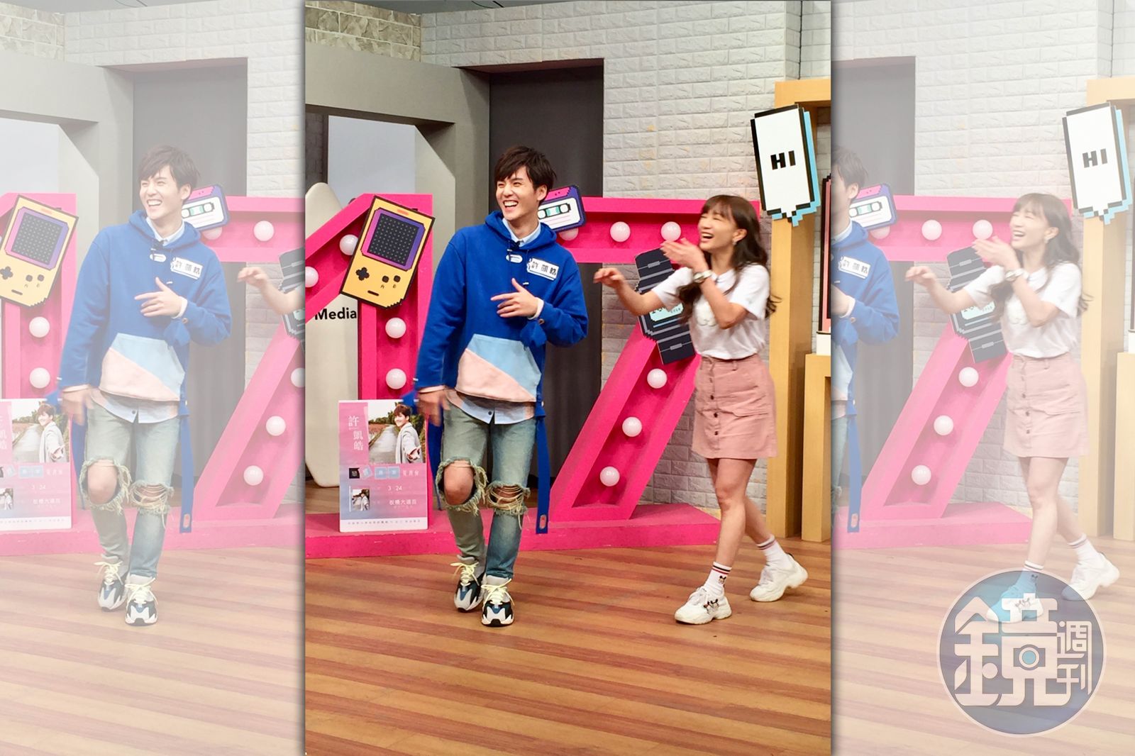 聽到許凱皓說有在擔任舞蹈老師教舞,黃鴻升和玉兔都好奇:「哇!你長這麼帥教舞,女學員上課一定都很開心,女生上課會專心嗎?」許凱皓說:「其實我上課滿嚴肅的,我會很在意她們有沒有認真學,有些原本沒有認真學的,看我這麼嚴肅,就變得開始認真了,之後有些人也越來越喜歡跳舞。」