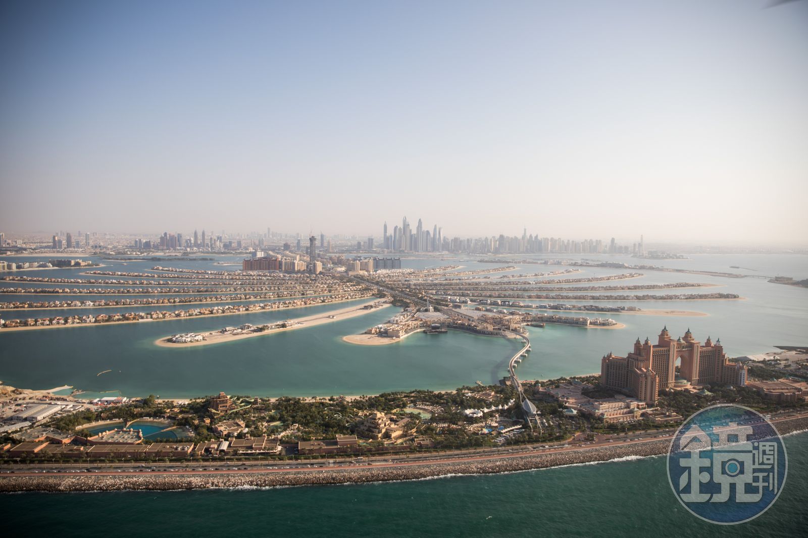 飛到一定高度,我們才發現剛剛的停機坪就位在著名的棕櫚島上,卻得飛到半空中才看見它的廬山真面目。駕駛沿著海岸線繼續往哈里發塔飛去,途中經過一晚要價新台幣5萬元的帆船酒店、模仿地球五大洲填出的人工島The World世界群島,再往前,就是杜拜的城市天際線,之前登過的杜拜相框變得很渺小,靠駕駛提醒才沒有錯過。