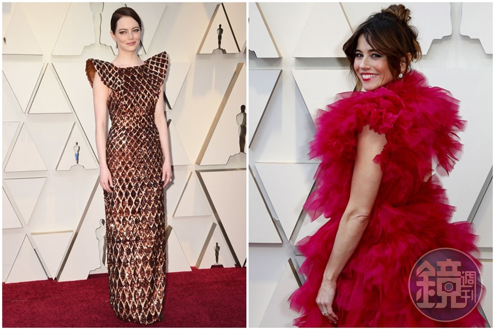 艾瑪史東身(左)穿「鬆餅裝」出席奧斯卡典禮,《幸福綠皮書》的琳達卡德琳妮的禮服則像極了洗車滾筒。(東方IC)發布時間:2019.02.25 12:07 臺北時間