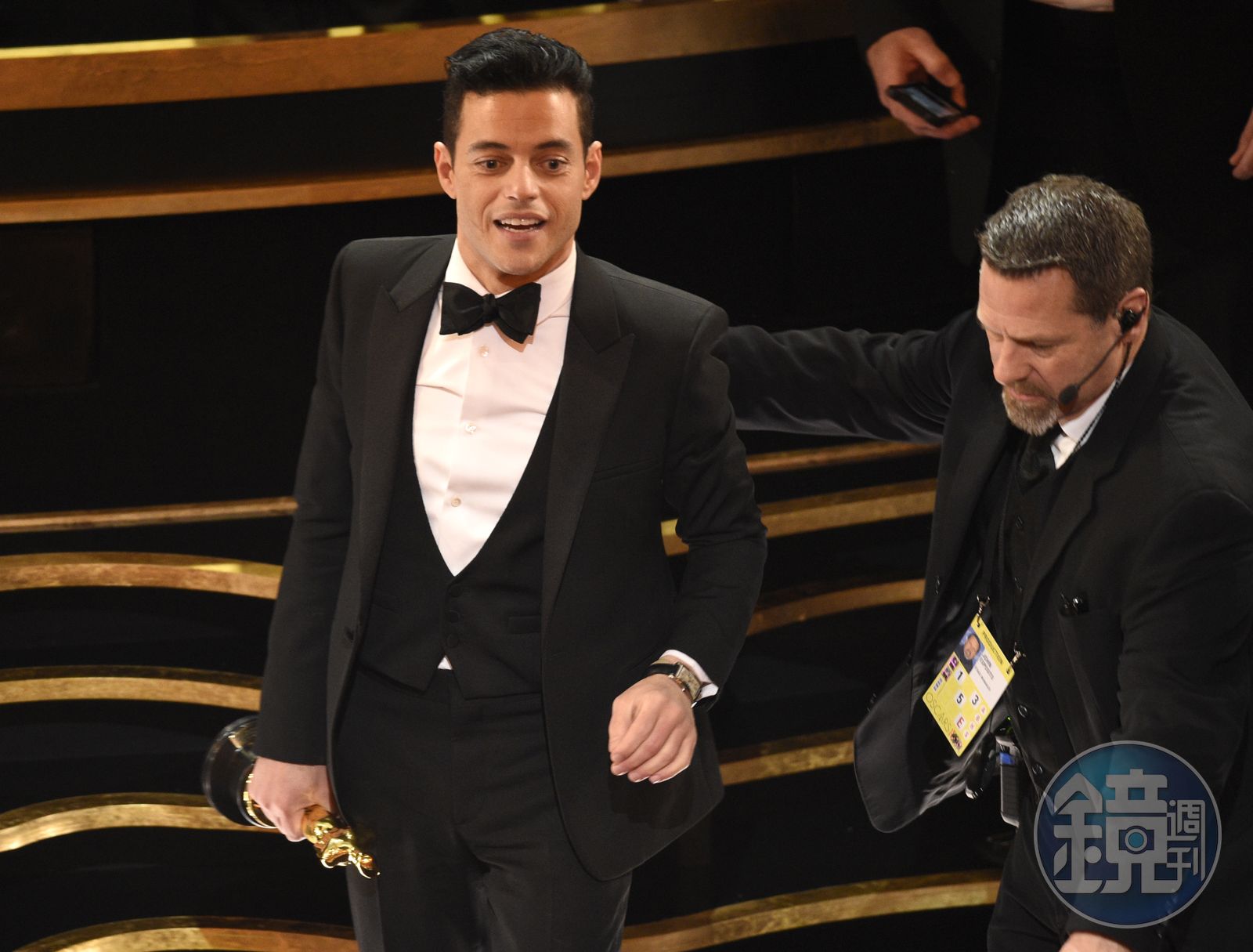 雷米馬利克從舞台上直接摔到觀眾席,被工作人員扶起來,要他坐下來。(東方IC)發布時間:2019.02.25 15:47 臺北時間