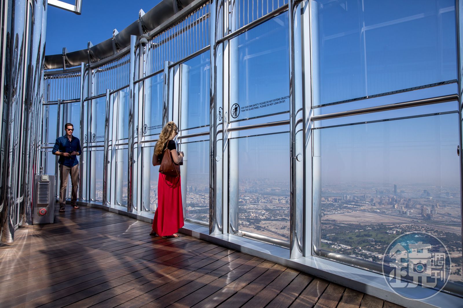 除了室內空間,148樓也設了露天展望台,四周圍上一層玻璃,據說這是金氏世界紀錄中世界最高的露天展望台,來到這裡,便可體會電影《不可能的任務:鬼影行動》拍攝的高難度,每個人都成了展翅高飛的鳥兒。