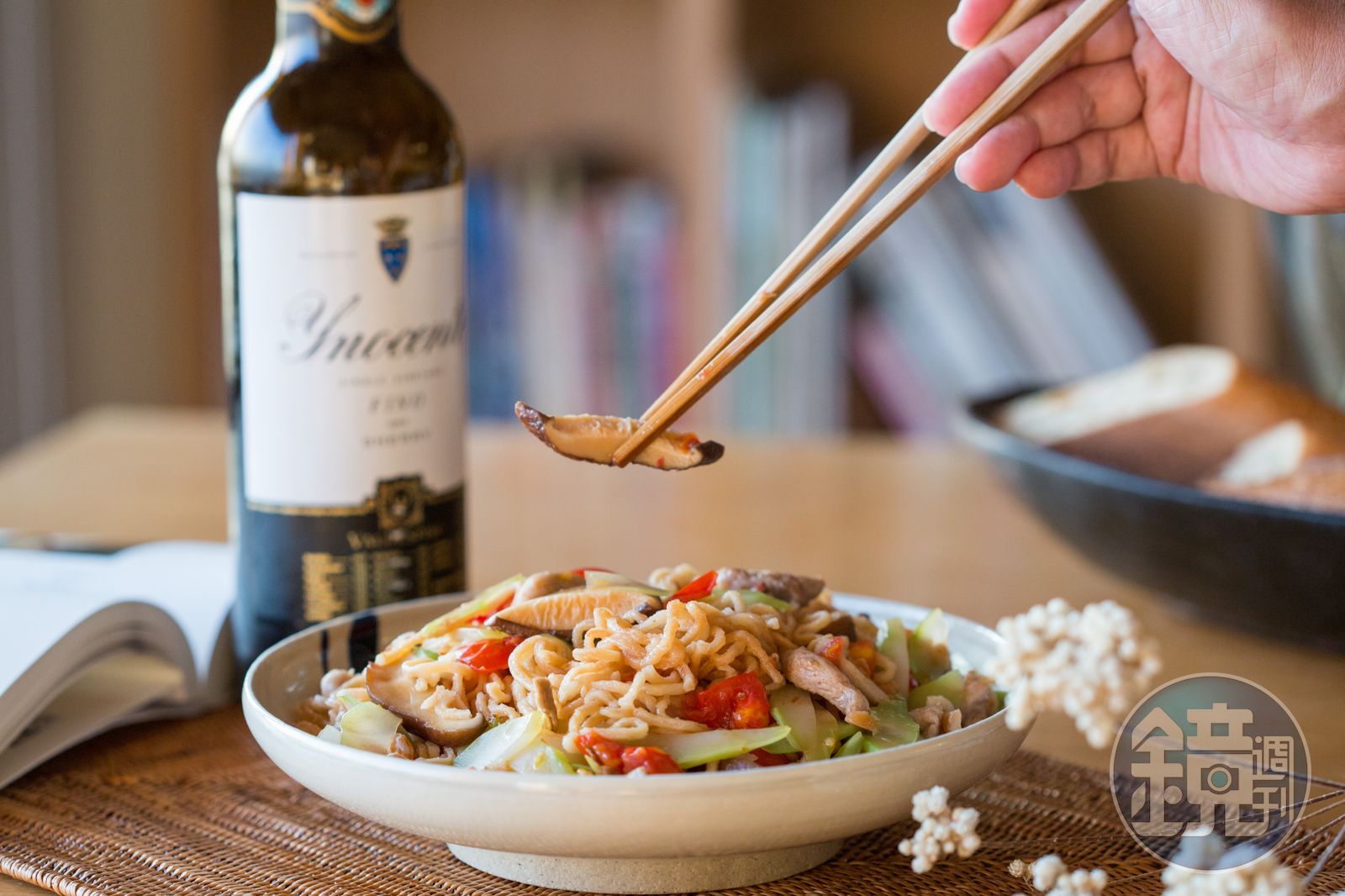 她端出特別煮給好友試試的「番茄豬肉香菇蝦米大心芥菜炒意麵」,就揉合「旬味」及「常備菜」的家常菜精髓。