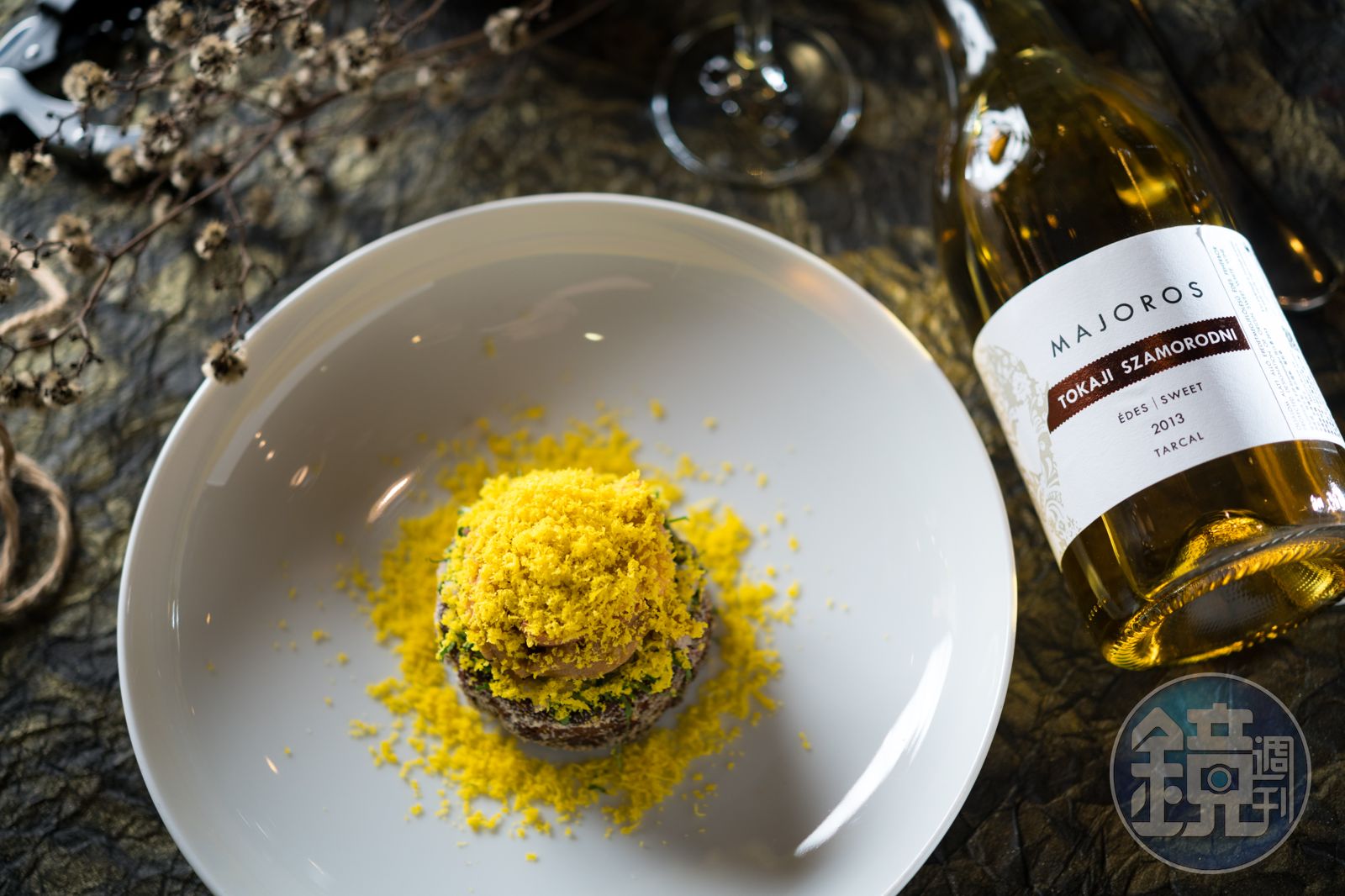 很有實驗性格的釀酒師,釀出的「莫若悠許 多卡伊Szamorodni甜白酒2013」放在橡木桶陳年3年,殘糖量與4簍貴腐酒相近,搭上Sheally最愛的「想想廚房」的「酥煎魚餅佐海膽嫩薑泥」,海膽的滑順與桶味相得益彰,金沙鹹蛋黃將甘甜往上提,紮實魚餅拌入有著檸檬香的油甘果,果酸搭起酒食橋樑,契合程度讓我不自覺腦補主廚Joseph在形容另一道「脆皮豬五花咖哩」時,雙手互扣的畫面。