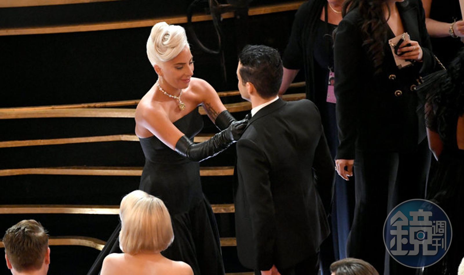 女神卡卡也幫新科影帝整理他的領結,沒想到上台還是歪了。(翻攝自twitter帳號@Chocmilksheikh1)發布時間:2019.02.26 18:29 臺北時間