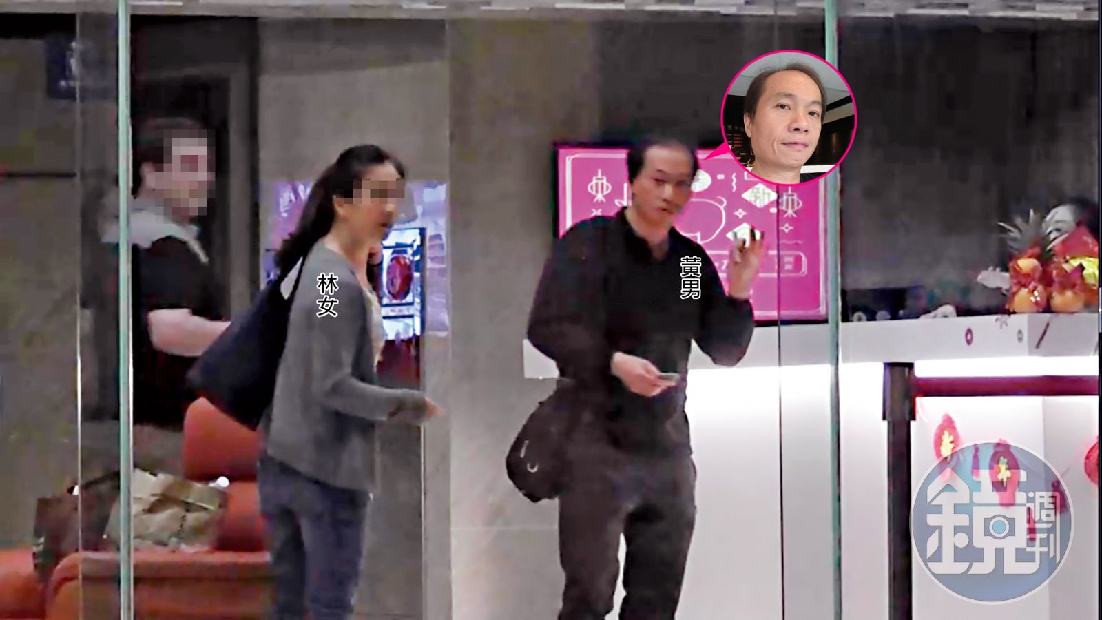 本刊發現黃男警覺性頗高,與林女下車後不斷東張西望,確定沒有疑慮後,2人分別從後車廂提取一袋疑似換洗衣物,才走進飯店。接著2人刻意保持距離,黃男在櫃台辦理入房手續,林女則在沙發休息區玩手機,待辦妥入房手續後,再一前一後走進電梯,直到隔天上午才退房。