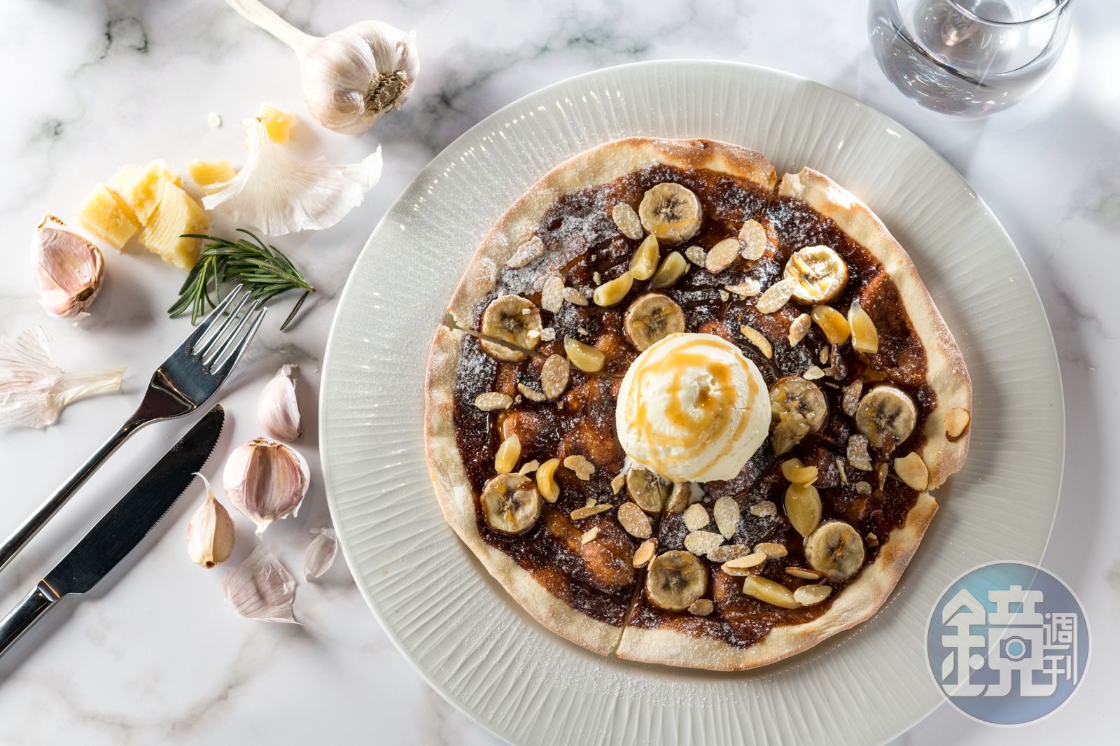微風南山引進韓系大蒜主題餐廳 糖漬蒜仁入披薩奇特又美味 「蒜頭香蕉巧克力醬披薩配香草冰淇淋」用韓國調味好的糖漬蒜仁配上香蕉、巧克力醬,很有哏。(380元/8吋)(Mad for Garlic Taiwan提供) 發布時間:2019.03.02 10:57 臺北時間